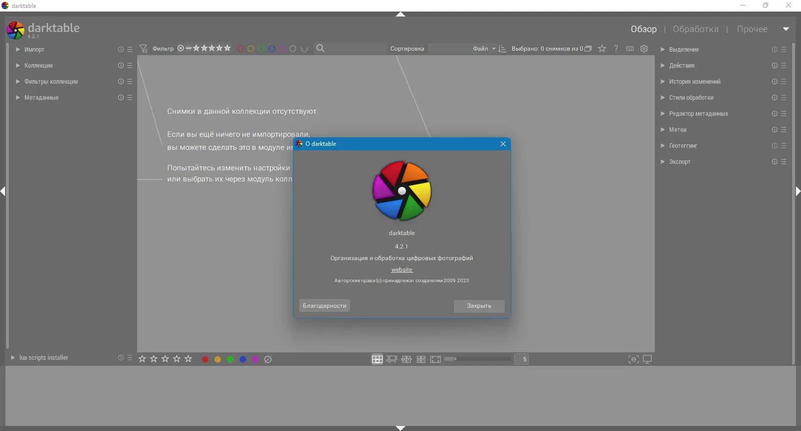 darktable — это свободный фоторедактор с открытым исходным кодом, предназначенный для профессиональной обработки цифровых снимков, включая RAW-файлы. Программа объединяет инструменты импорта, каталогизации, редактирования и экспорта изображений в единой среде. Интерфейс оптимизирован для высокой производительности и удобства при работе с большими коллекциями фотографий.