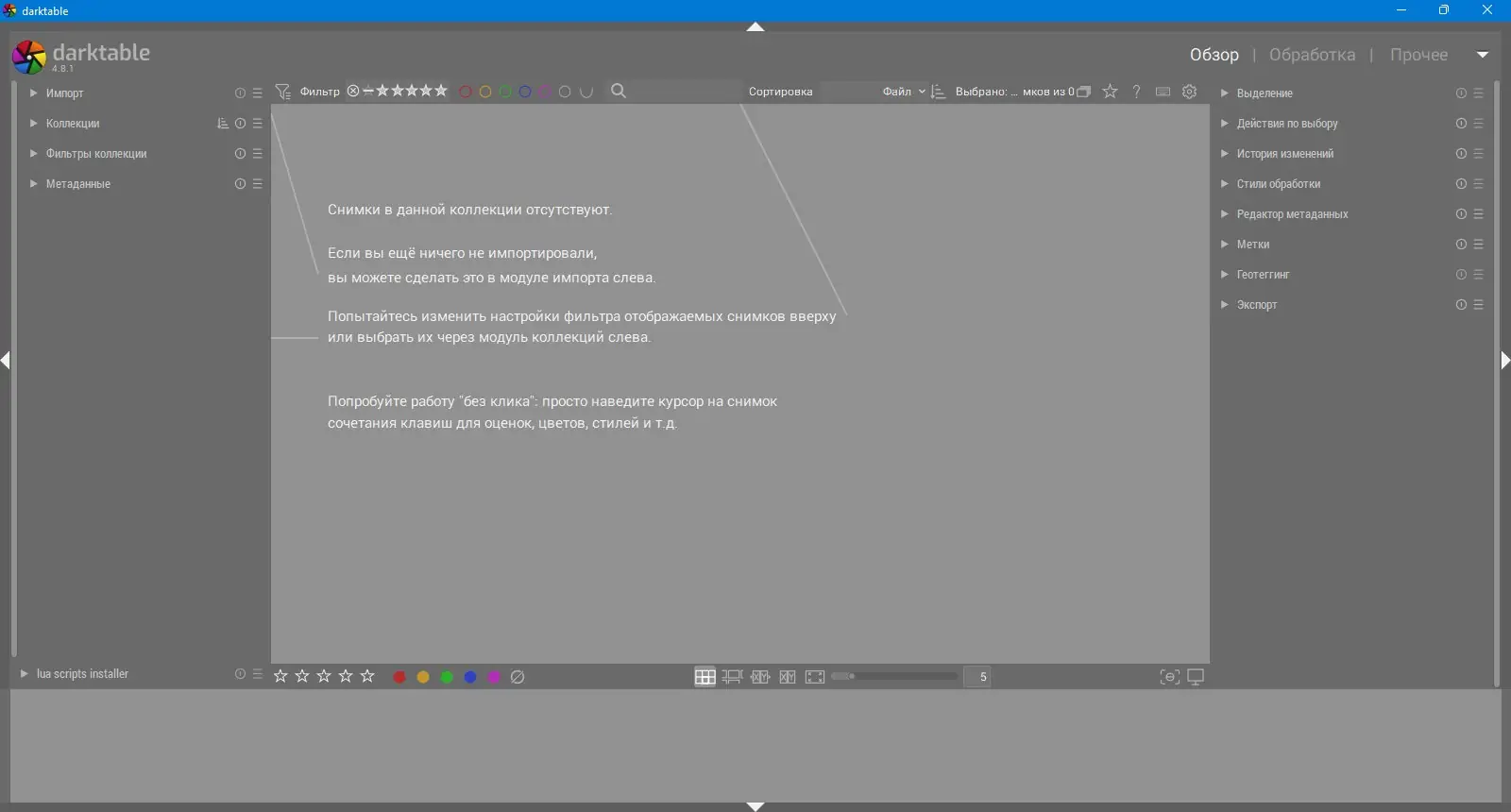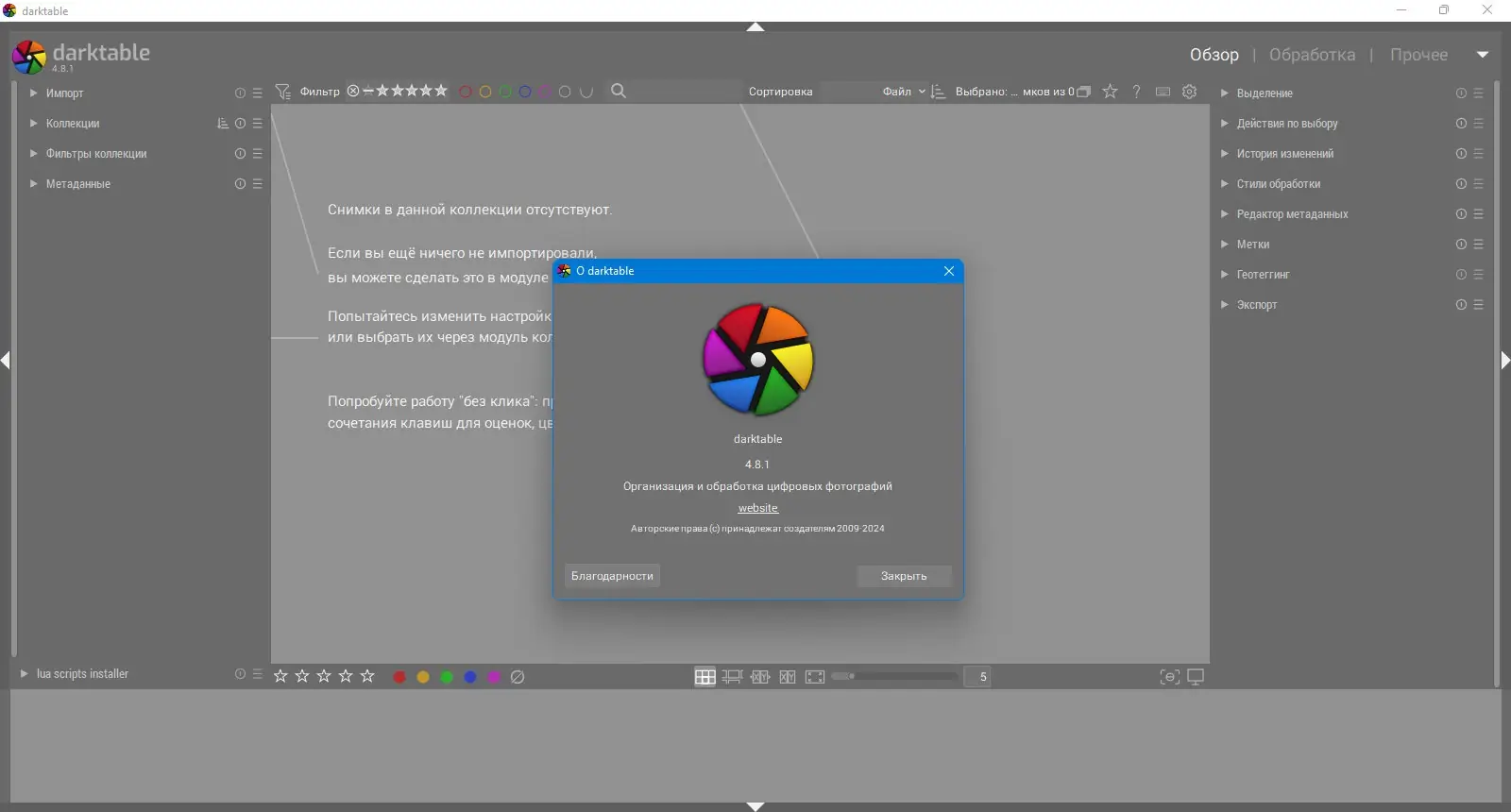 Darktable — это мощный open-source фоторедактор, ориентированный на профессиональную обработку изображений, включая RAW-файлы, с продуманной системой управления коллекциями и расширенными инструментами коррекции. Программа предлагает не только широкие возможности редактирования, но и эффективную организацию рабочего процесса: от импорта снимков до экспорта в различные форматы и облачные сервисы. Интерфейс оптимизирован под высокую производительность благодаря кэшированию метаданных и предварительных превью, что обеспечивает плавную работу даже с большими библиотеками.