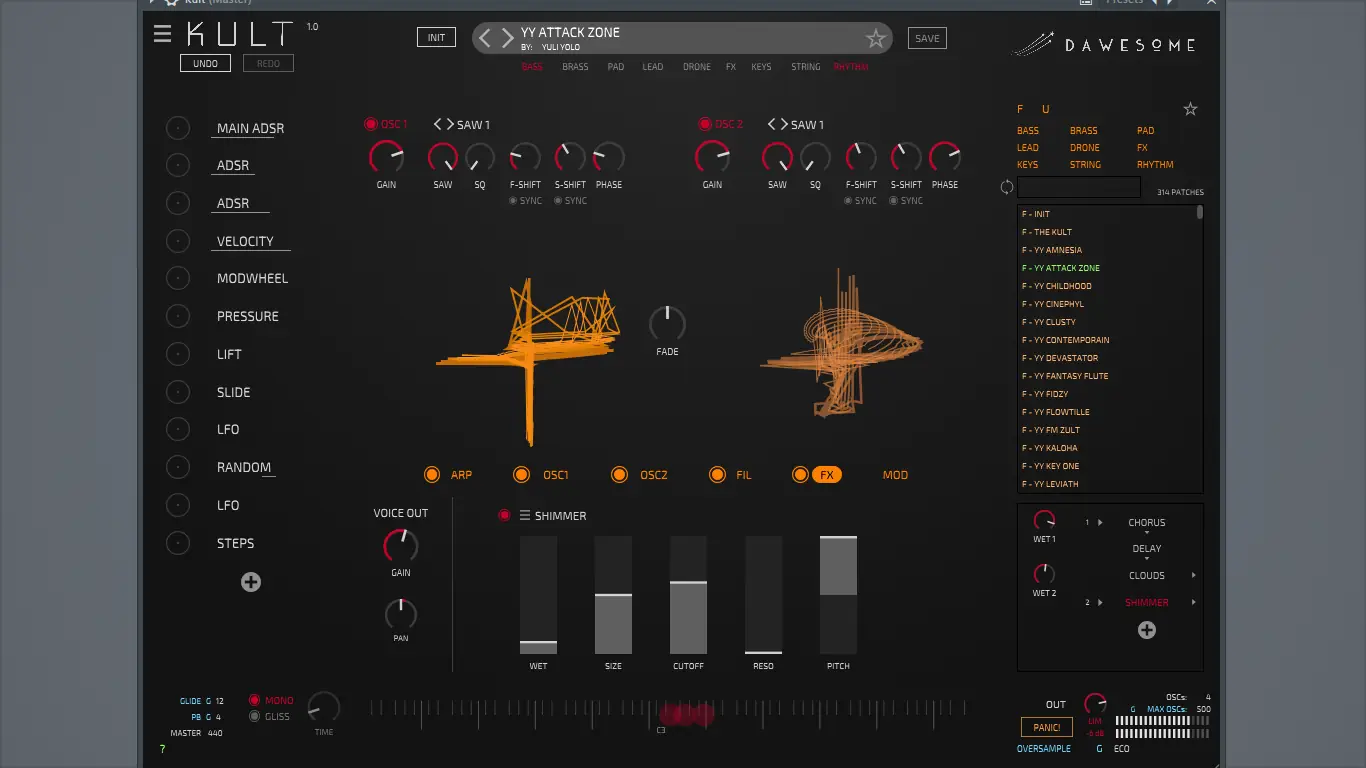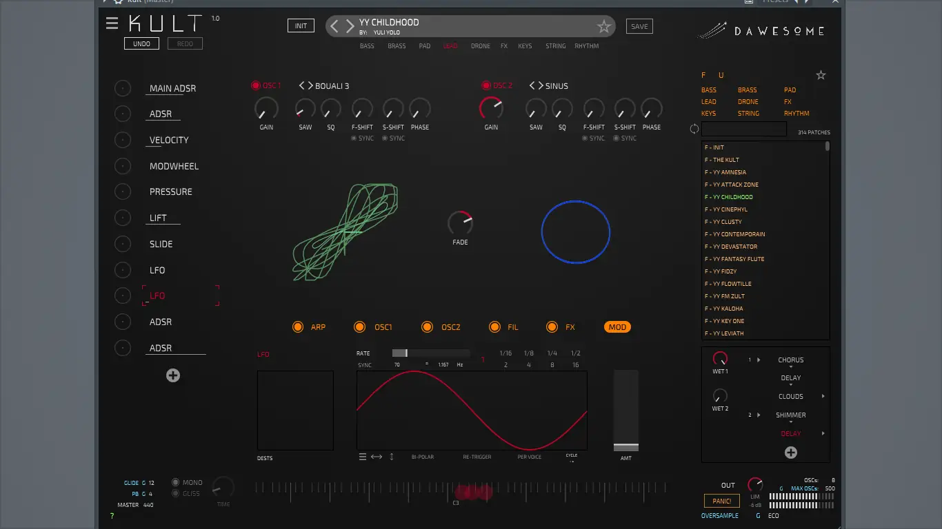 Dawesome — Kult — это мощный виртуальный синтезатор, основанный на математических моделях хаоса, который открывает новые горизонты в создании уникальных звуков. С его помощью можно генерировать тембры от винтажных до футуристических, используя инновационные методы синтеза и визуальную обратную связь.
