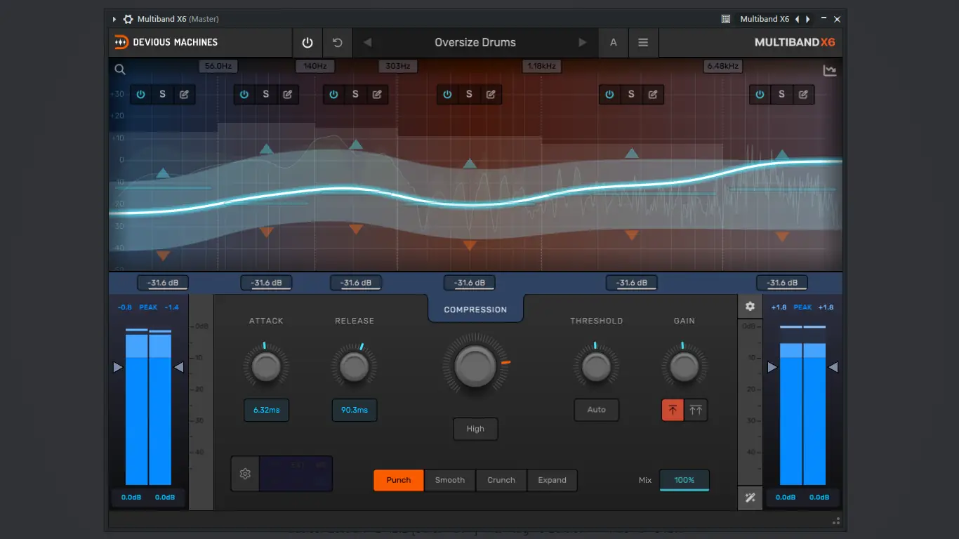 - Multiband X6 предлагает шестиполосную динамическую обработку с интеллектуальной компенсацией уровня и макроуправлением.