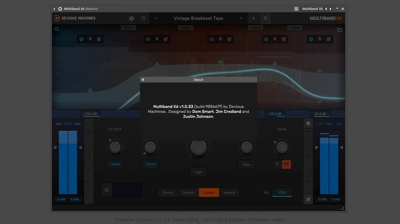 - Multiband X6 предлагает шестиполосную динамическую обработку с интуитивным макроуправлением и тремя режимами сжатия — Smooth, Crunch и Punch.