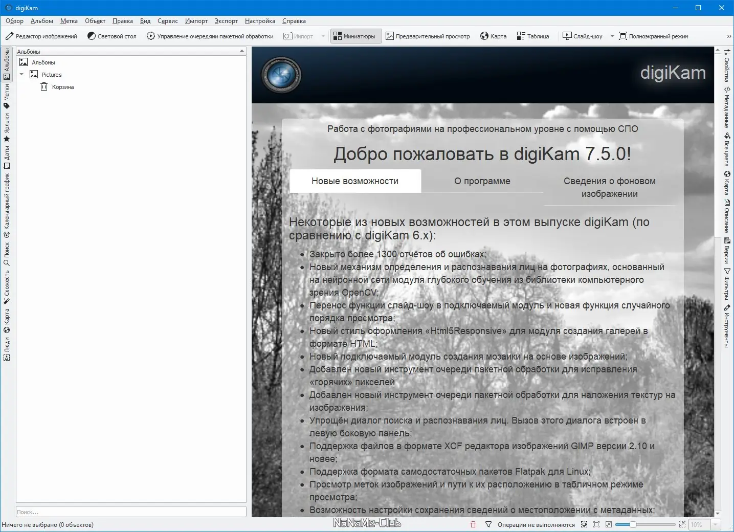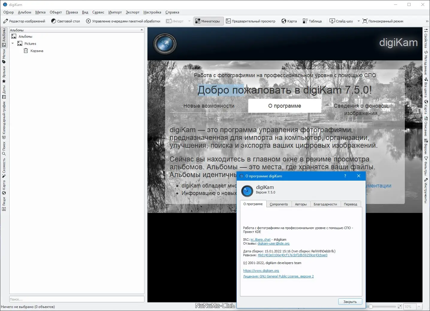 digiKam — это мощный и функциональный photo manager, разработанный для управления, каталогизации и обработки цифровых фотографий. Программа поддерживает широкий спектр форматов, включая RAW, и предлагает инструменты для автоматической сортировки, редактирования, поиска и публикации изображений. Идеально подходит как для любителей, так и для профессионалов, работающих с большими фотоколлекциями.