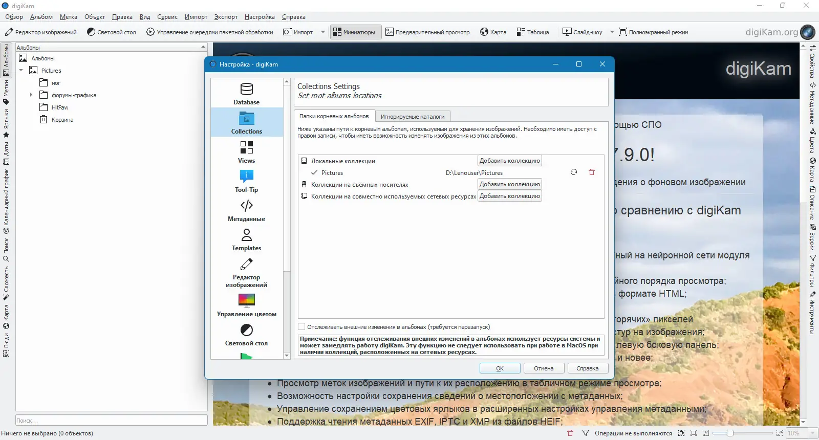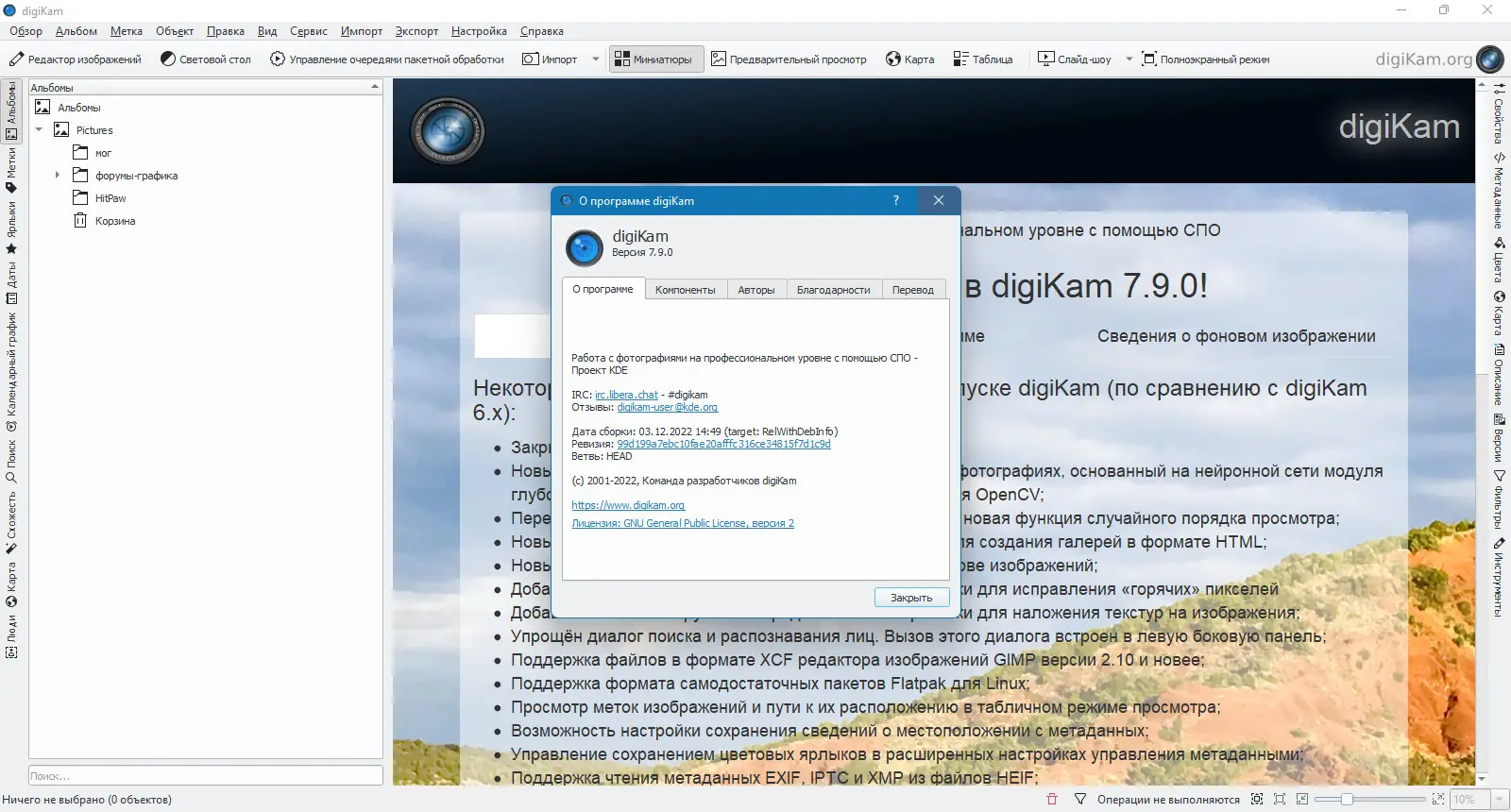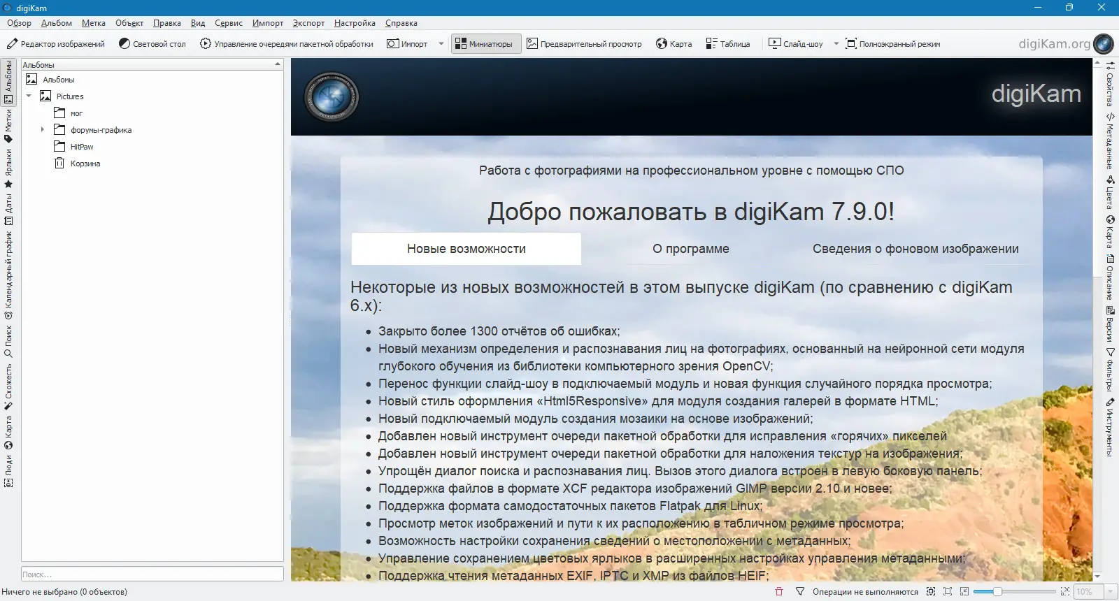 digiKam — это мощный open-source photo manager, предназначенный для эффективной сортировки, просмотра, редактирования и каталогизации цифровых фотографий. Программа поддерживает широкий спектр форматов, включая RAW, JPEG, PNG, TIFF и видеофайлы, а также работает с метаданными EXIF, IPTC и XMP. Она идеально подходит для фотографов, которым необходимо управлять большой коллекцией снимков, отслеживать геолокации, добавлять теги и оценки, а также использовать продвинутые инструменты обработки. Интерфейс интуитивно понятен, а функционал адаптирован как для новичков, так и для профессионалов.