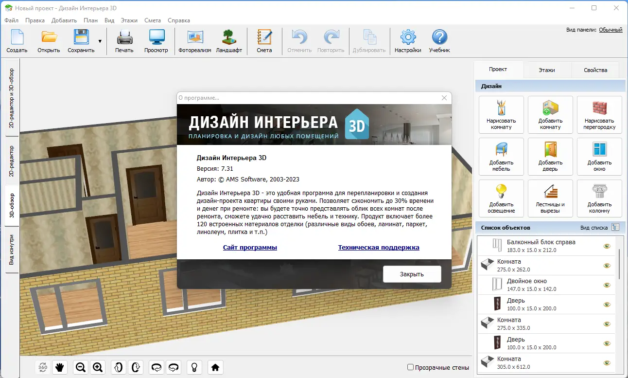 «Дизайн Интерьера 3D» — это интуитивно понятная программа для создания реалистичных дизайн-проектов жилых и офисных помещений. С её помощью можно быстро спроектировать планировку квартиры, расставить мебель и подобрать отделочные материалы, визуализируя результат в трёхмерном формате. Инструмент подходит как для новичков, так и для тех, кто хочет сэкономить на услугах профессиональных дизайнеров, ведь вы сможете увидеть конечный вид интерьера ещё до начала ремонта. Программа работает без подключения к интернету и не требует глубоких знаний в области архитектуры или 3D-моделирования.