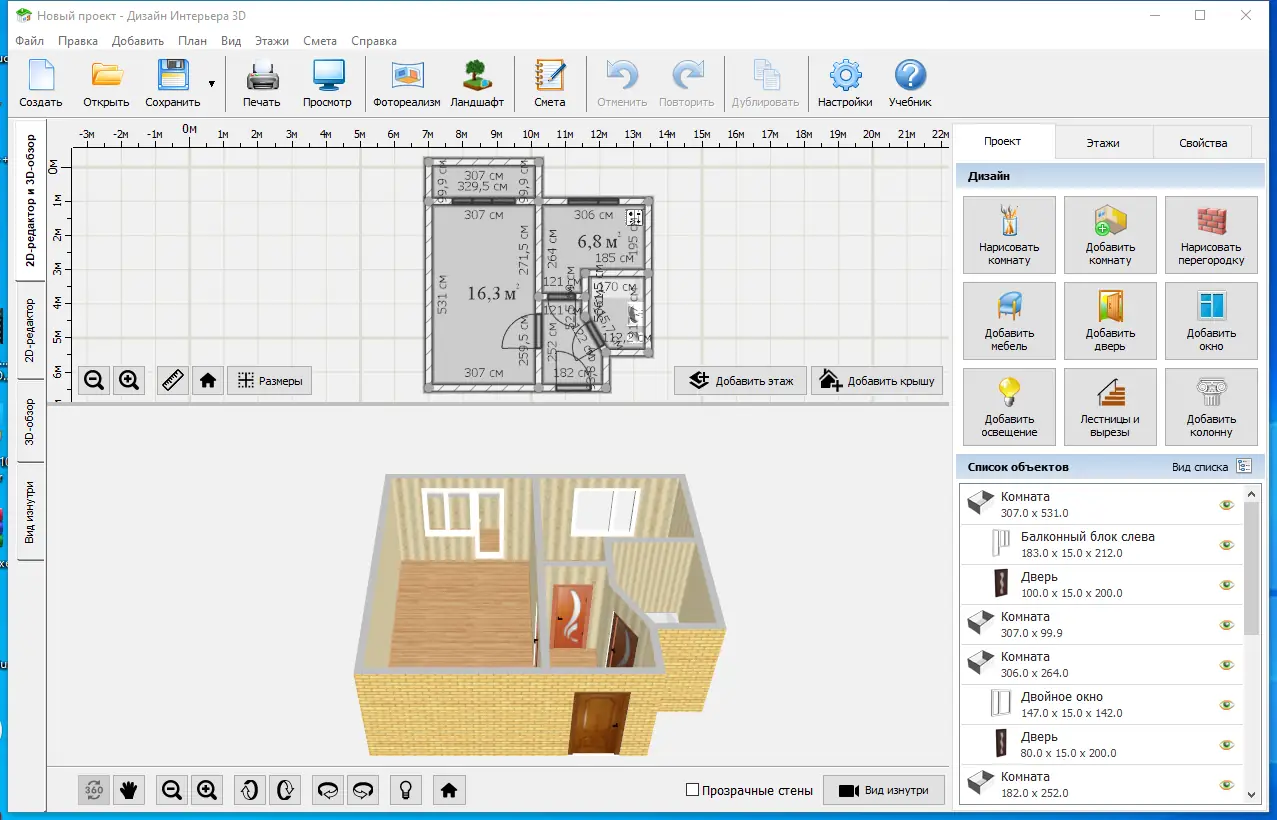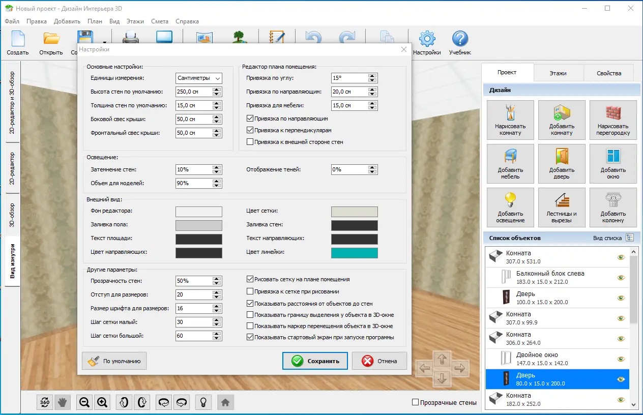 - Программа поддерживает точное проектирование помещений с указанием габаритов стен, дверей и окон, что позволяет избежать ошибок при реальном ремонте.