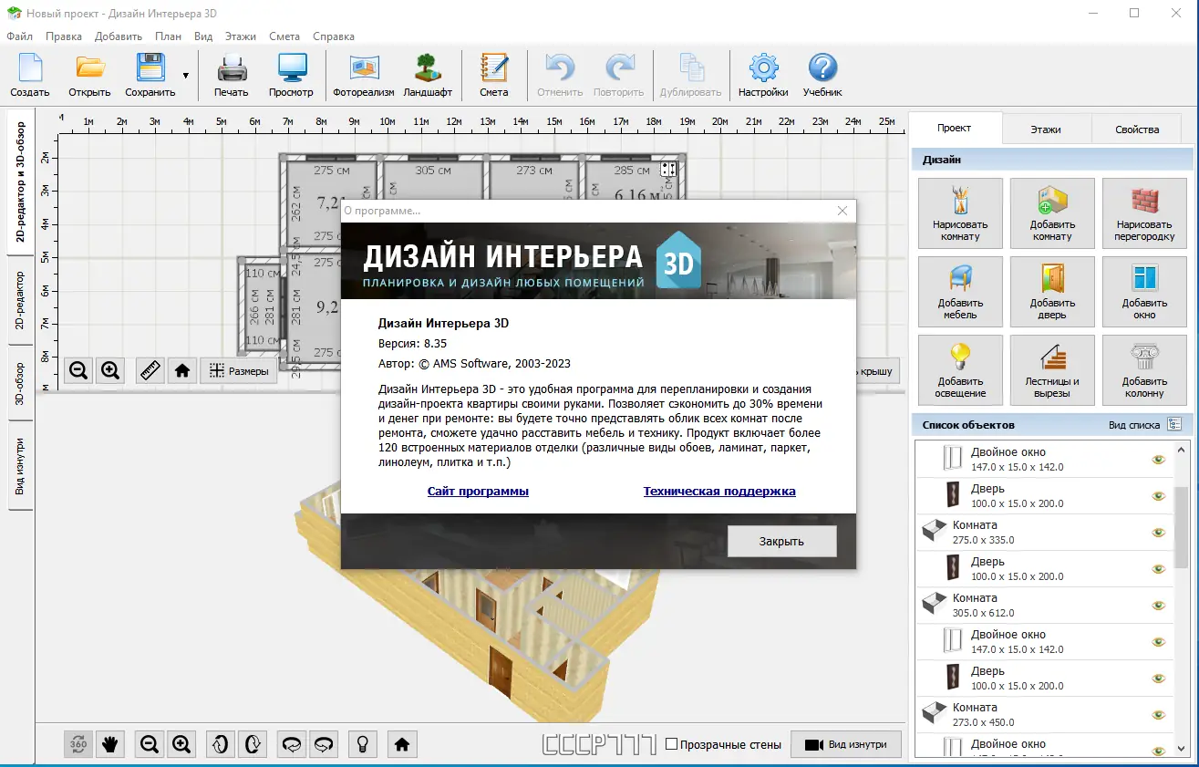 «Дизайн Интерьера 3D» — это программа для создания реалистичных интерьерных проектов с точной расстановкой мебели и отделочных материалов. Инструмент позволяет спланировать перепланировку квартиры, визуализировать облик комнат в 3D и избежать ошибок при ремонте. Вы сможете заранее увидеть результат, подобрать цветовые решения и сэкономить время и бюджет. Программа подходит как для новичков, так и для тех, кто хочет протестировать идеи без привлечения дизайнеров. Она работает локально, не требует постоянного интернет-подключения, что делает её удобной для автономного использования.