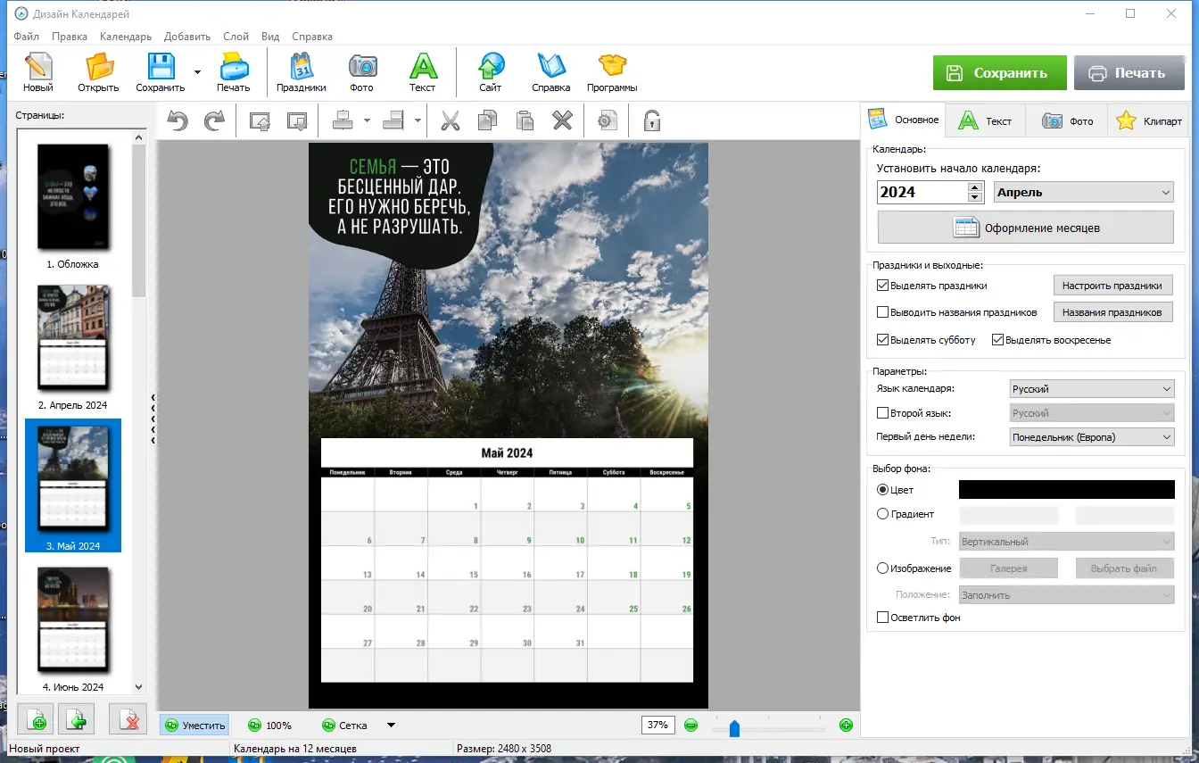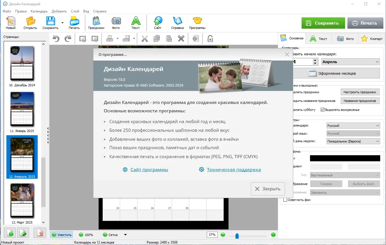Дизайн Календарей — это удобное приложение для создания персонализированных календарей с фотографиями на любой год или месяц. Программа предлагает множество шаблонов, инструментов оформления и поддержку печати в домашних и профессиональных условиях. Подходит как для личного использования, так и для бизнеса.