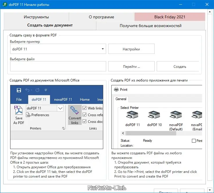doPDF представляет собой утилиту, предназначенную для создания PDF-файлов из любых документов, поддерживающих печать. Установка добавляет в систему виртуальный принтер, который появляется в списке доступных устройств в разделе «Принтеры». Это позволяет конвертировать содержимое без необходимости открывать сторонние редакторы или облачные сервисы. Программа поддерживает множество форматов: от файлов Microsoft Excel, Word и PowerPoint до HTML-страниц и электронных писем. Процесс преобразования происходит быстро и не требует глубоких технических знаний. Продукт совместим с основными версиями Windows, включая 7, 8.1, 10 и 11, как в 32-, так и в 64-битных редакциях.