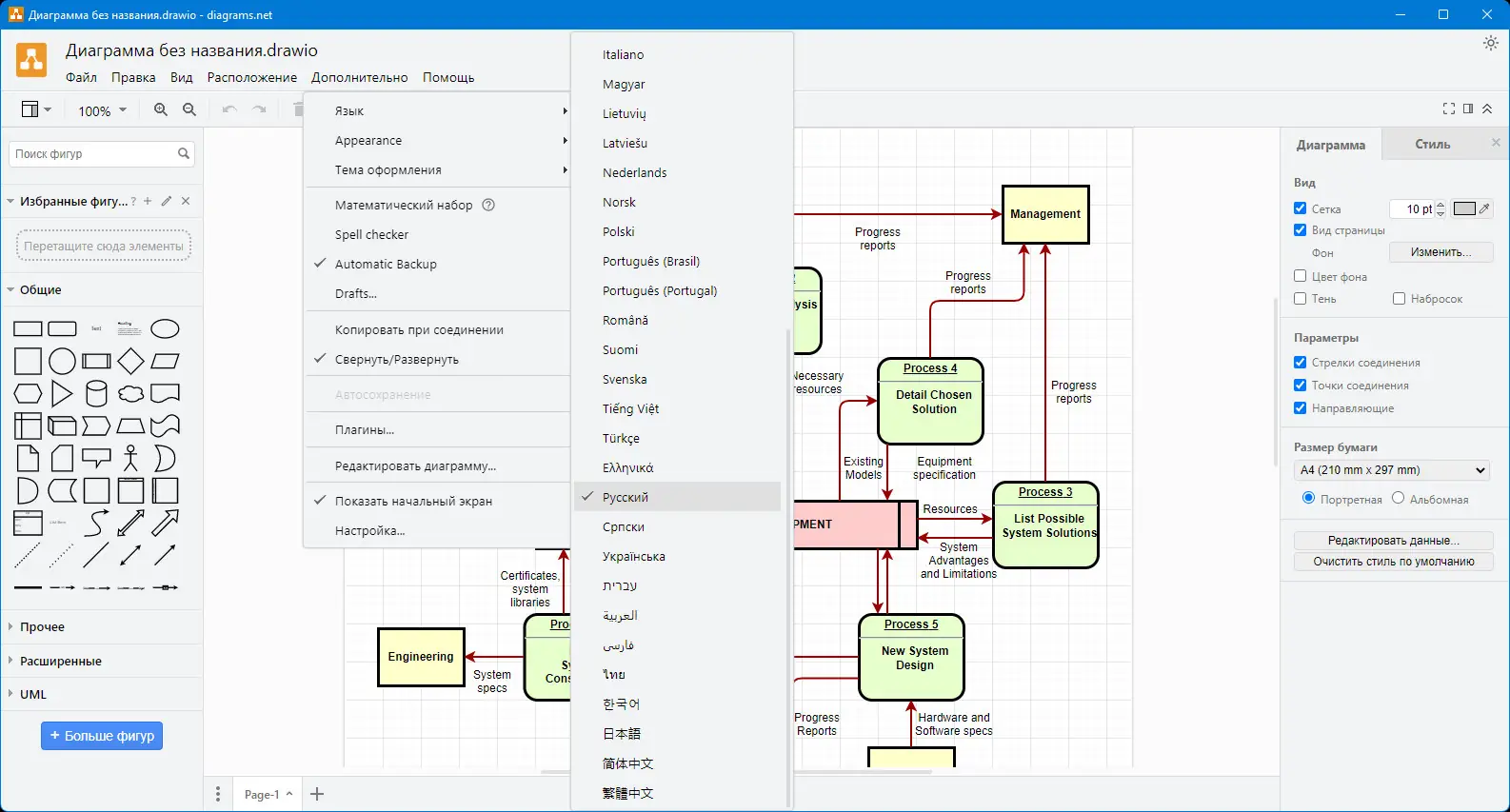 - Поддержка множества форматов экспорта, включая PNG, JPEG, SVG, XML и PDF.