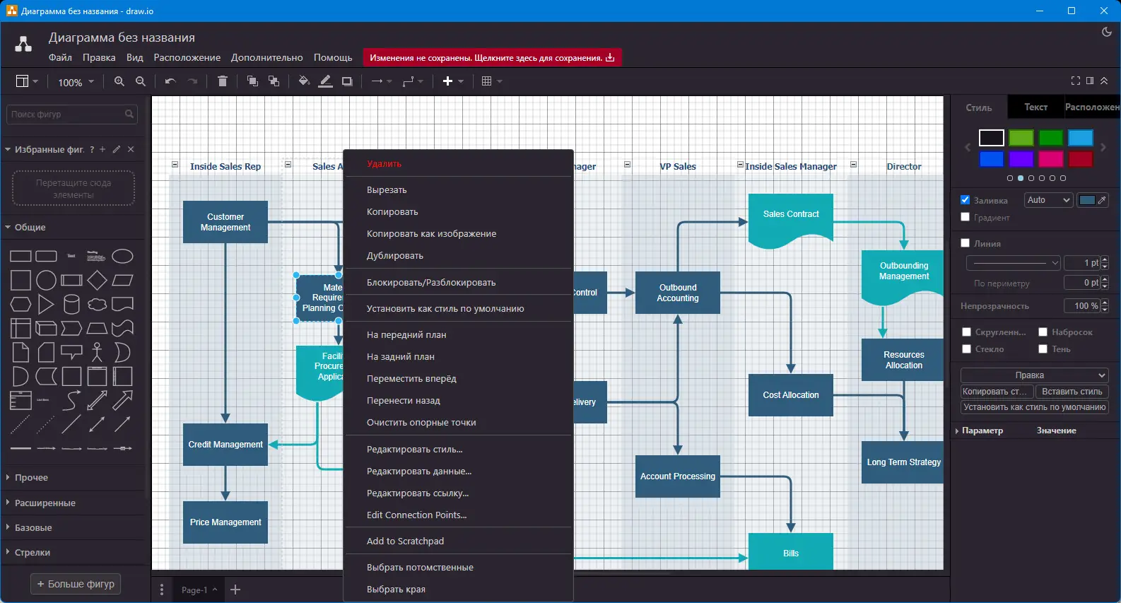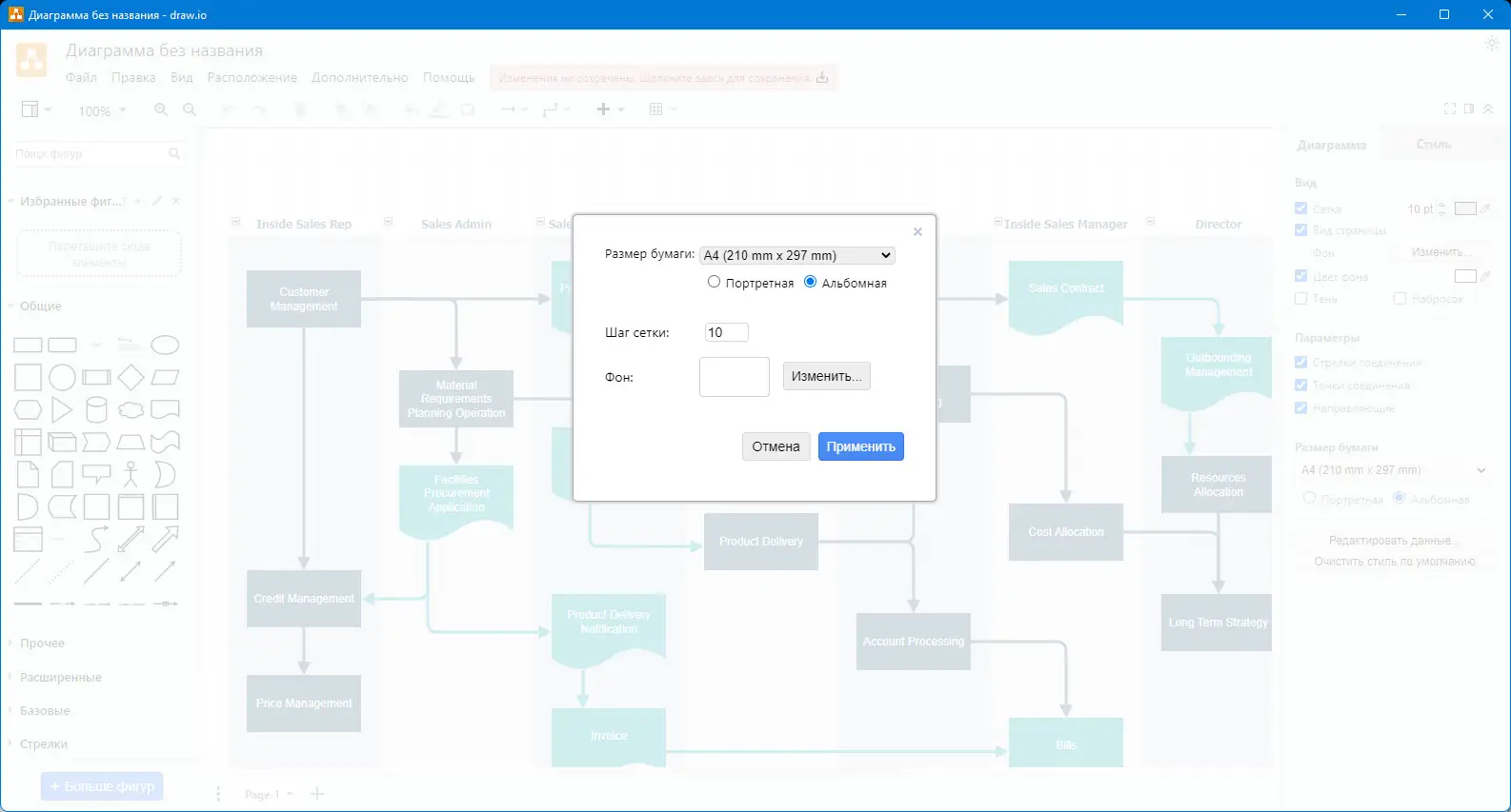 - Возможность создания поточной диаграммы для отображения последовательности процессов