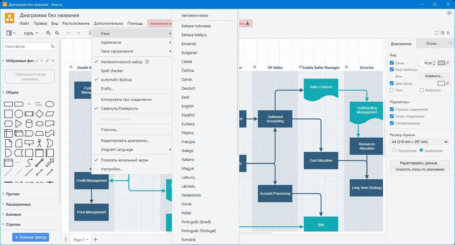 Использование Draw.io не требует глубоких технических знаний. После запуска приложения пользователь получает доступ к рабочему полю и панели инструментов с готовыми фигурами, линиями и текстовыми блоками. Элементы можно перетаскивать, редактировать, группировать и подстраивать под нужный масштаб. Поддерживается экспорт в различные форматы, включая PNG, JPEG, SVG и PDF, что обеспечивает совместимость с другими приложениями. Работа с канбан-доской позволяет организовать задачи по этапам выполнения, а создание UML-диаграмм упрощает разработку программного обеспечения. Для сетевых инженеров доступна сетевая диаграмма, отображающая топологию и соединения. Диаграмма Венна помогает визуализировать пересечения между множествами в аналитике и логике.