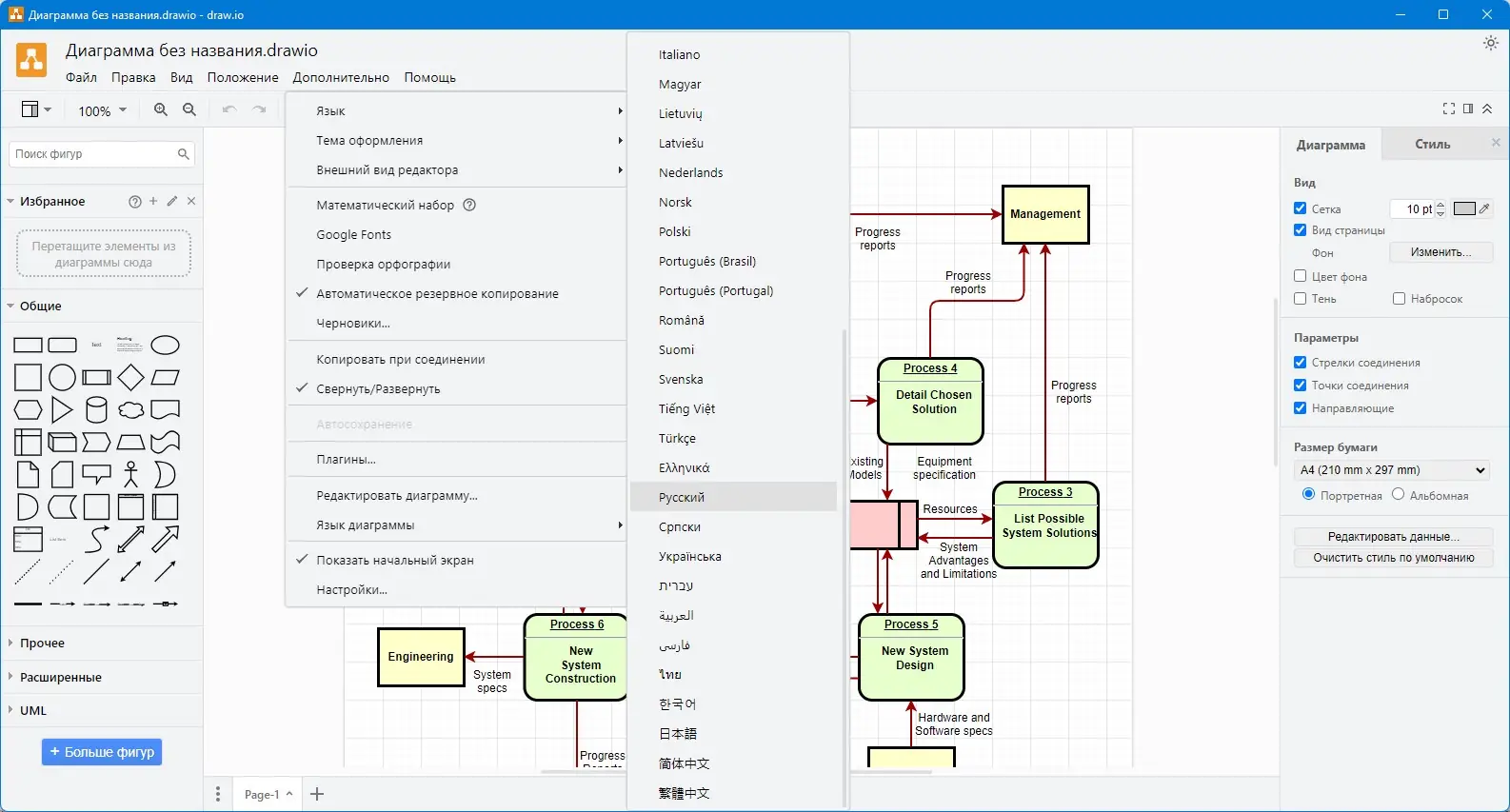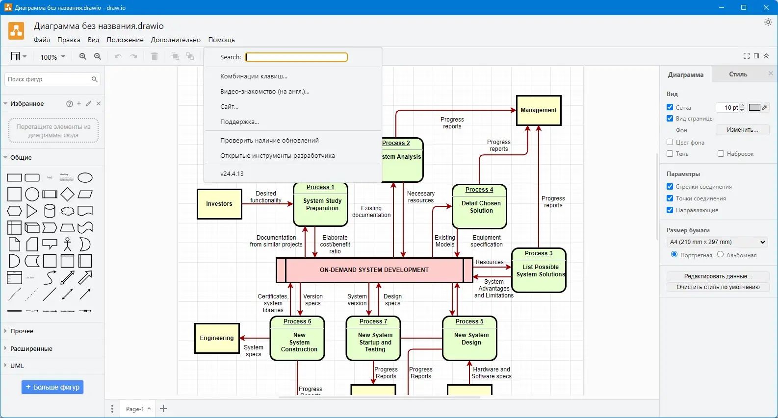 Работа с Draw.io начинается с выбора типа диаграммы и загрузки одного из готовых шаблонов или создания проекта с нуля. Панель инструментов предлагает широкий набор фигур, стрелок и соединителей, которые легко перетаскиваются на холст и настраиваются по размеру и стилю. Текстовые блоки добавляются мгновенно, поддерживают форматирование и многоуровневое выравнивание, что делает оформление диаграмм профессиональным.