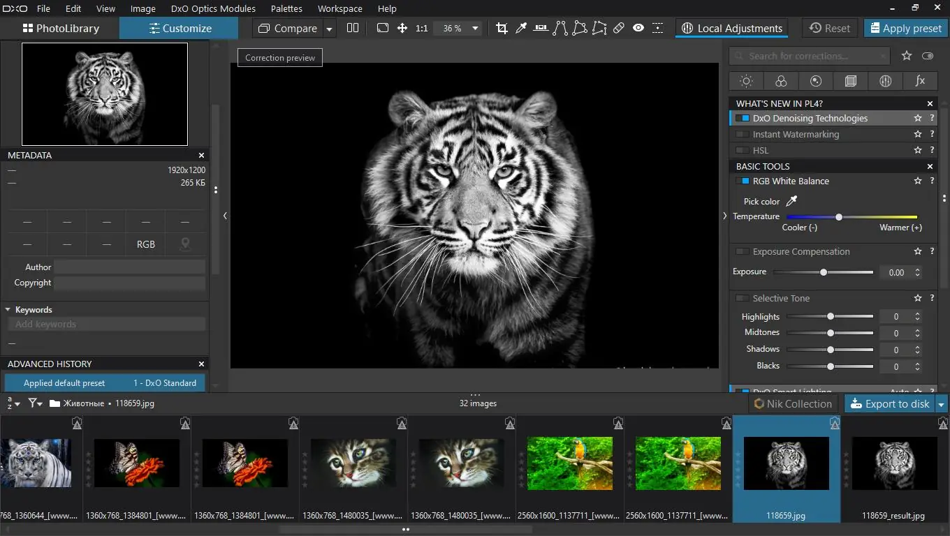 Интерфейс DxO PhotoLab интуитивно понятен и ориентирован на эффективную работу с большим количеством изображений. После импорта файлов программа автоматически применяет коррекции, основанные на базе данных калибровок DxO, включая исправление дисторсии, виньетирования и хроматических аберраций. Пользователь может в любой момент отключить автоматику или внести ручные правки с помощью инструментов локальной коррекции, масок и слайдеров. Работа с цветом осуществляется через точные инструменты баланса белого, насыщенности и тонального диапазона. Поддержка технологии U Point позволяет выделять области простым кликом, без необходимости вручную рисовать маски. Экспорт настраивается гибко: можно выбрать формат, размер, качество и назначение — от веб-публикаций до архивирования.
