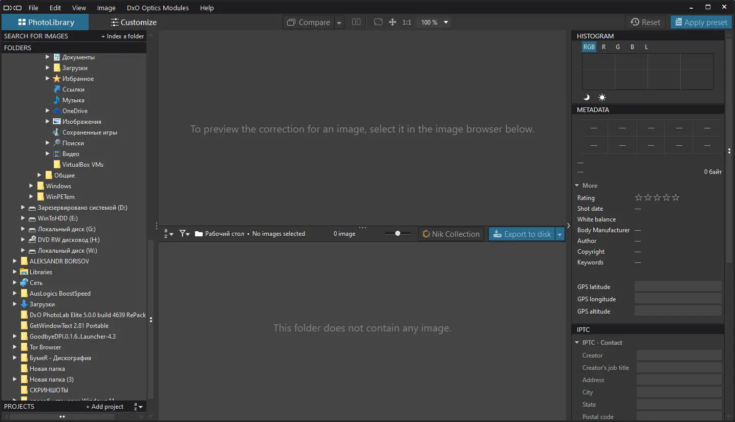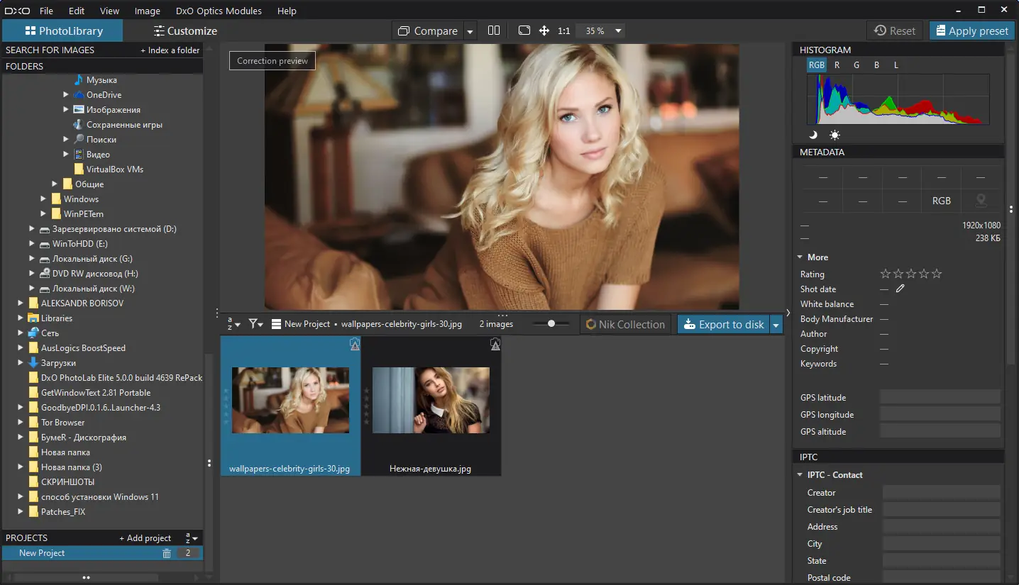 Интерфейс DxO PhotoLab интуитивно понятен: после импорта изображения оно сразу проходит автоматическую коррекцию на основе профилей камеры и объектива. Пользователь может в любой момент отключить или изменить эти настройки, перейдя в режим ручной коррекции. Все инструменты сгруппированы по категориям: экспозиция, цвет, детализация, оптические исправления и эффекты. Работа с пресетами ускоряет обработку серии снимков — достаточно настроить один кадр и применить параметры к остальным. Экспорт поддерживает несколько форматов одновременно, включая JPEG, TIFF и DNG, с возможностью сохранения метаданных и настроек.