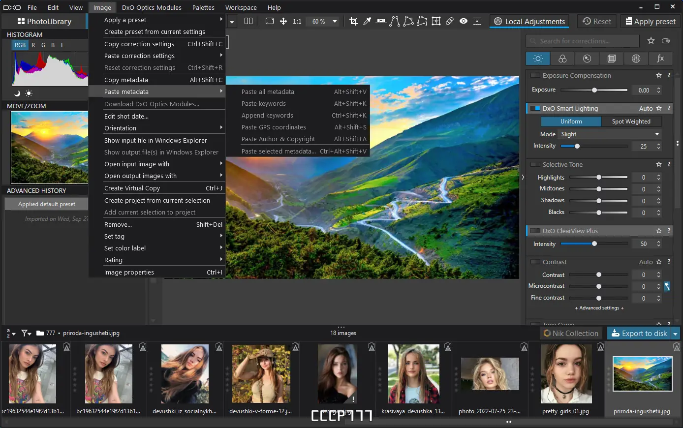 DxO PhotoLab — это программный редактор изображений, ориентированный на обработку фотографий с максимально возможным сохранением качества. Он специализируется на работе с RAW-файлами, предоставляя интеллектуальные инструменты для автоматической коррекции, при этом оставляя полный контроль за процессом в руках пользователя. Программа учитывает характеристики конкретных камер и объективов, что позволяет устранять оптические искажения с высокой точностью. Она поддерживает широкий спектр настроек, включая цветокоррекцию, баланс белого, экспозицию и детализацию. Благодаря научной базе DxO в области калибровки и измерений, каждый этап редактирования основан на точных данных.