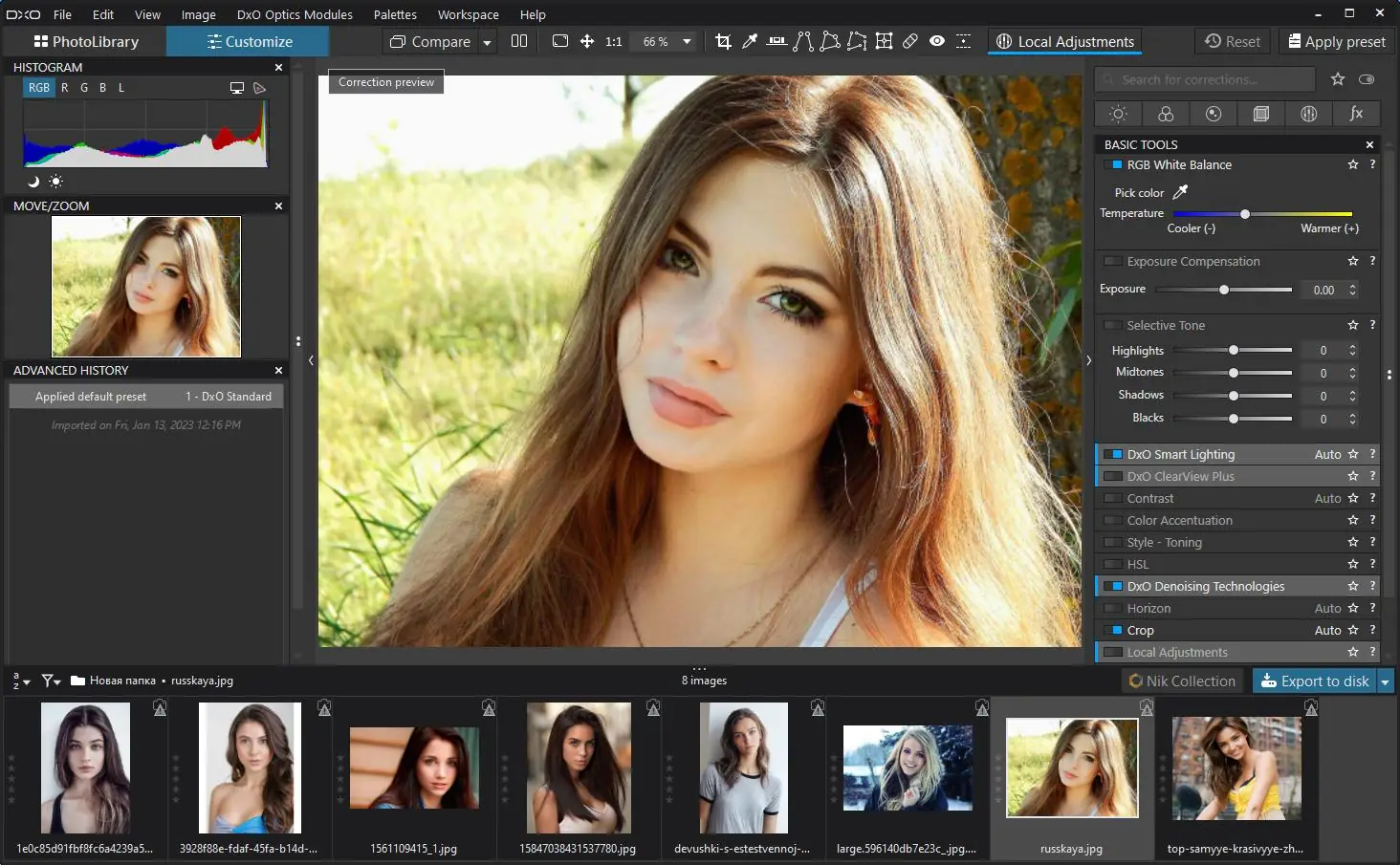 Работа в DxO PhotoLab организована через модульную систему коррекций, где каждая функция представлена отдельным блоком на боковой панели. Пользователь может последовательно применять настройки экспозиции, цвета, резкости, шумоподавления и оптических исправлений. Интерфейс позволяет переключаться между режимами просмотра до и после, а также настраивать прозрачность каждого эффекта. Пресеты можно создавать, редактировать и применять к другим снимкам, что ускоряет обработку серийных фотографий. Экспорт выполняется в нескольких форматах одновременно, включая JPEG, TIFF и DNG, с возможностью настройки размера, разрешения и профиля цветности.