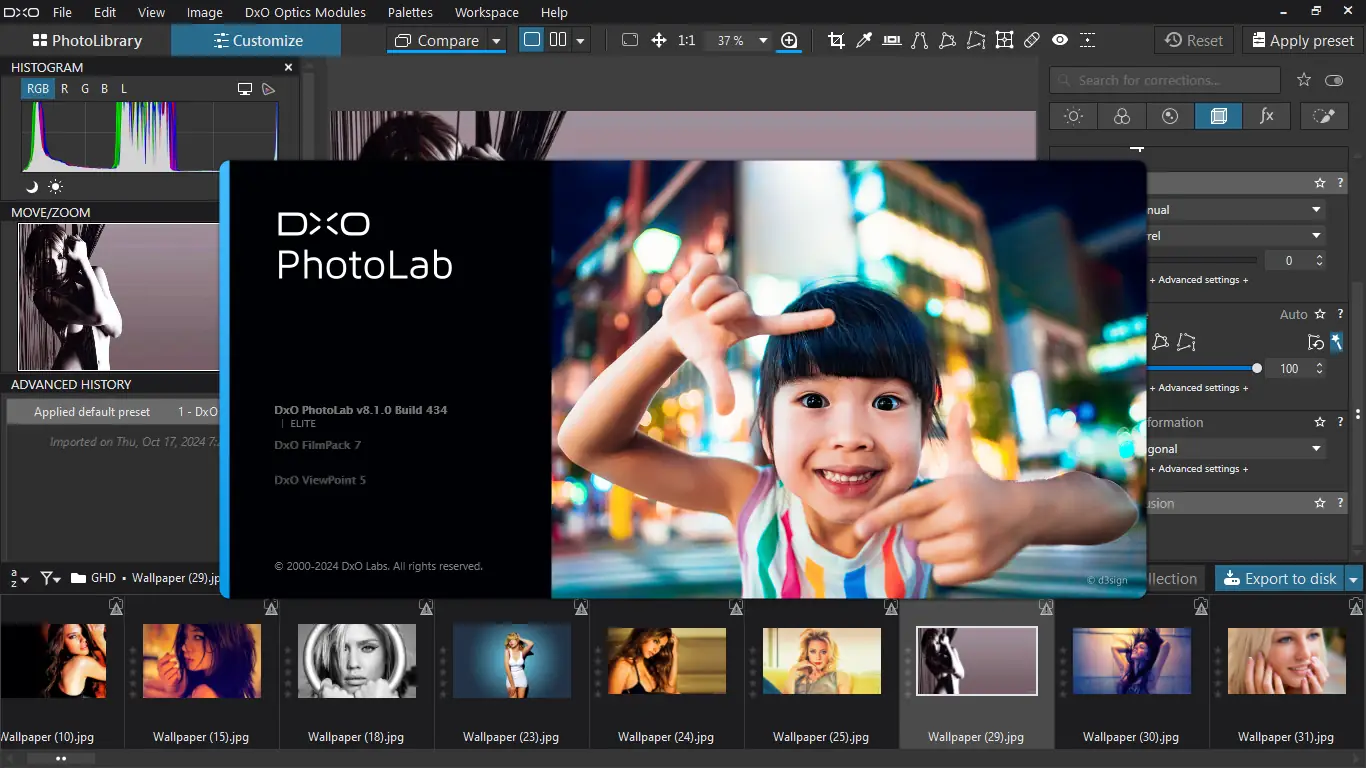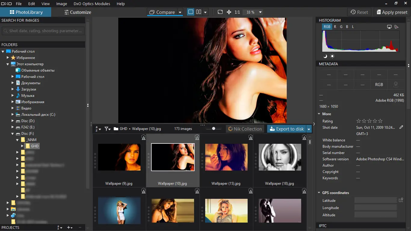 Интерфейс DxO PhotoLab организован логично и ориентирован на плавный рабочий процесс. После импорта изображения пользователь сразу получает доступ к автоматическим исправлениям, активируемым одним щелчком. Эти коррекции включают в себя оптимизацию экспозиции, баланса белого, контраста и цветности. При необходимости можно вручную настроить любую область снимка с помощью точечного редактирования — достаточно кликнуть по нужному участку, чтобы применить локальную коррекцию. Для творческой обработки доступны пресеты, имитация пленочных эффектов, градуированные фильтры и точечная ретушь. Экспорт реализован гибко: можно сохранять изображения в разных форматах, с изменением размера, с водяными знаками и для загрузки в социальные сети.