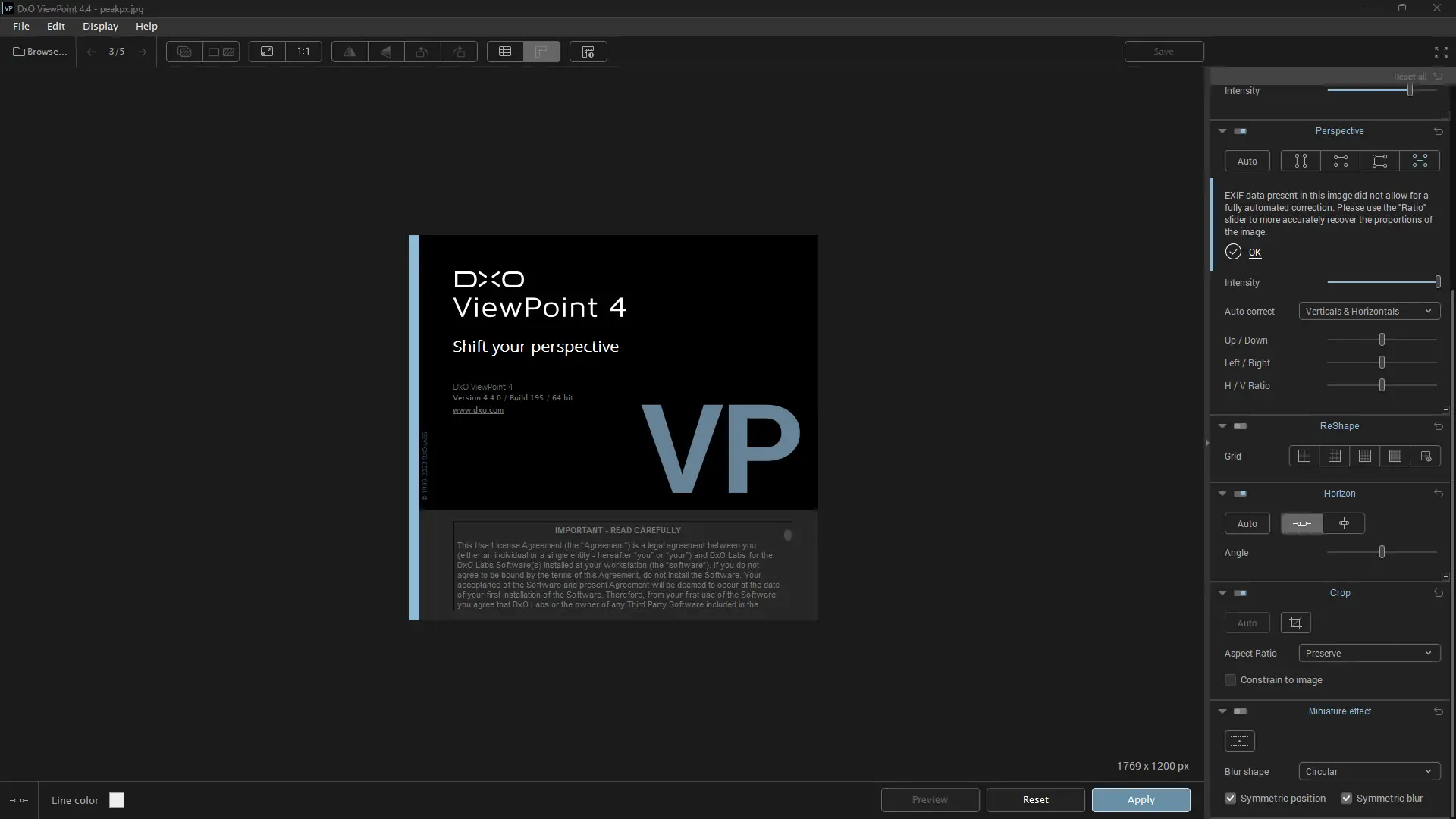Использование программы начинается с загрузки изображения через интерфейс или запуска через хост-редактор. После анализа метаданных файл автоматически корректируется согласно профилю устройства, на котором он был сделан. Пользователь может дополнительно настроить параметры с помощью слайдеров: угол наклона, горизонтальную и вертикальную перспективу, степень кадрирования.