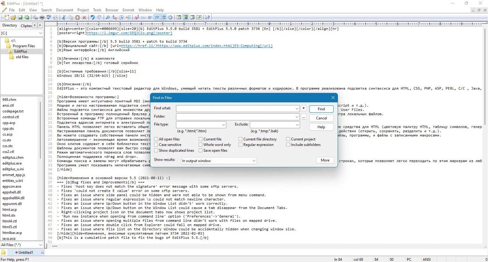 - Регулярные выражения в поиске и замене, а также поиск по множеству файлов