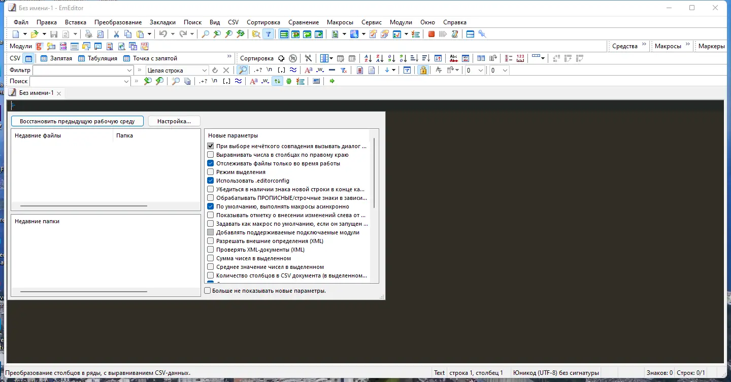 Использование Emurasoft EmEditor начинается с настройки рабочего пространства. После запуска программы можно импортировать пользовательские темы оформления с расширением .eetheme, что позволяет быстро изменить внешний вид редактора. Для активации подсветки синтаксиса определённого языка, например C++ или PHP, доступна функция импорта файлов .esy через меню «Сервис — Выбрать конфигурацию». Поддержка Drag & Drop упрощает перетаскивание фрагментов кода, а режим вертикального выделения помогает редактировать столбцы текста. Пользователи могут создавать макросы, записывать последовательности действий и назначать горячие клавиши для быстрого доступа. Работа с CSV и TSV файлами упрощена за счёт специального режима разделителей, а полноэкранный режим помогает сосредоточиться на коде. Дополнительные плагины, такие как «Структура», «Фрагменты» и «Предварительный просмотр веб-страниц», расширяют функциональность программы. Для оптимизации производительности можно указать временную папку в настройках и настроить поведение при аварийном восстановлении.