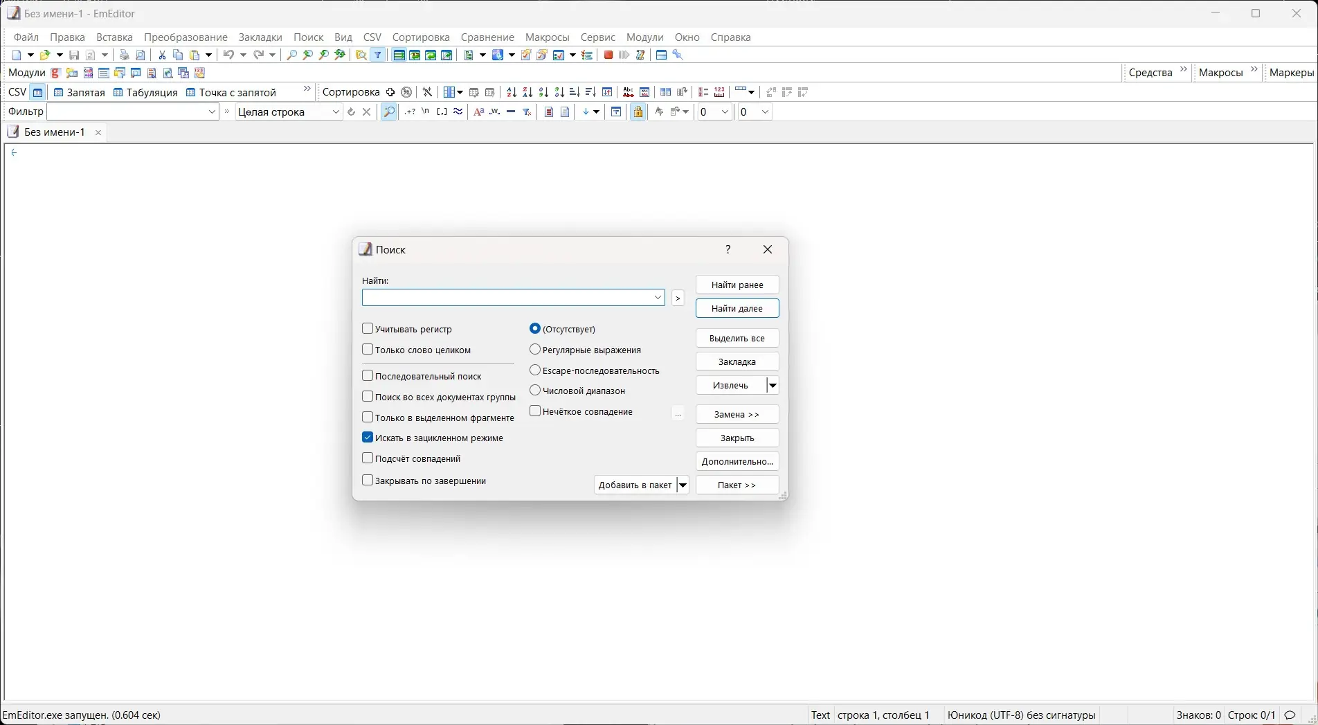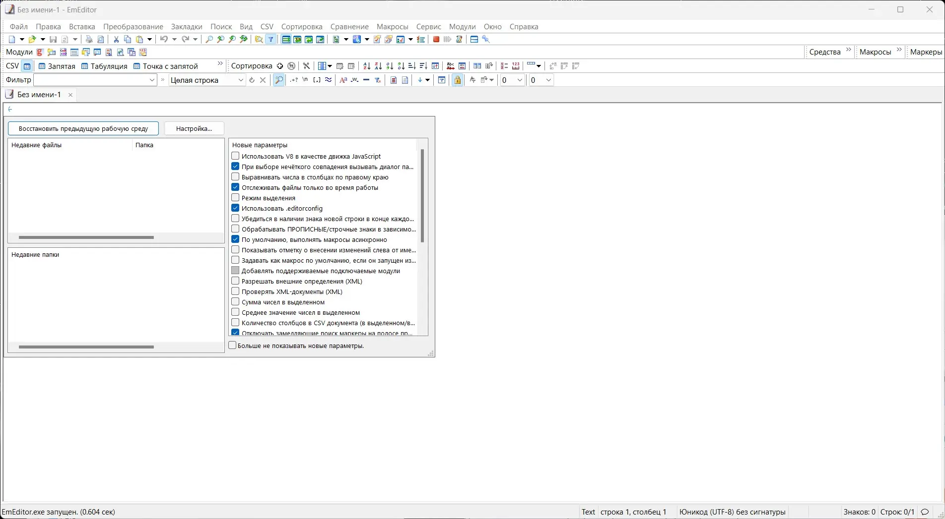 Emurasoft EmEditor — это высокопроизводительный текстовый редактор, ориентированный на программистов, веб-разработчиков и тех, кто работает с большими объёмами текста. Программа поддерживает Unicode, обладает мощной подсветкой синтаксиса, работает с файлами размером до 248 ГБ и позволяет автоматизировать задачи с помощью макросов на JavaScript и VBScript. Благодаря оптимизированному движку, редактор быстро загружается и стабильно функционирует даже при обработке сложных проектов.