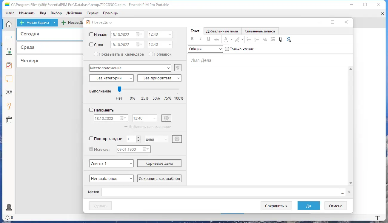 EssentialPIM — это универсальный менеджер персональной информации, объединяющий календарь, задачи, заметки, контакты и менеджер паролей в одном приложении. Программа предлагает продуманный интерфейс, поддержку шифрования, синхронизацию с мобильными устройствами и возможность работы в портативном режиме. Подходит для личного и корпоративного использования, обеспечивая высокий уровень организации и безопасности данных.