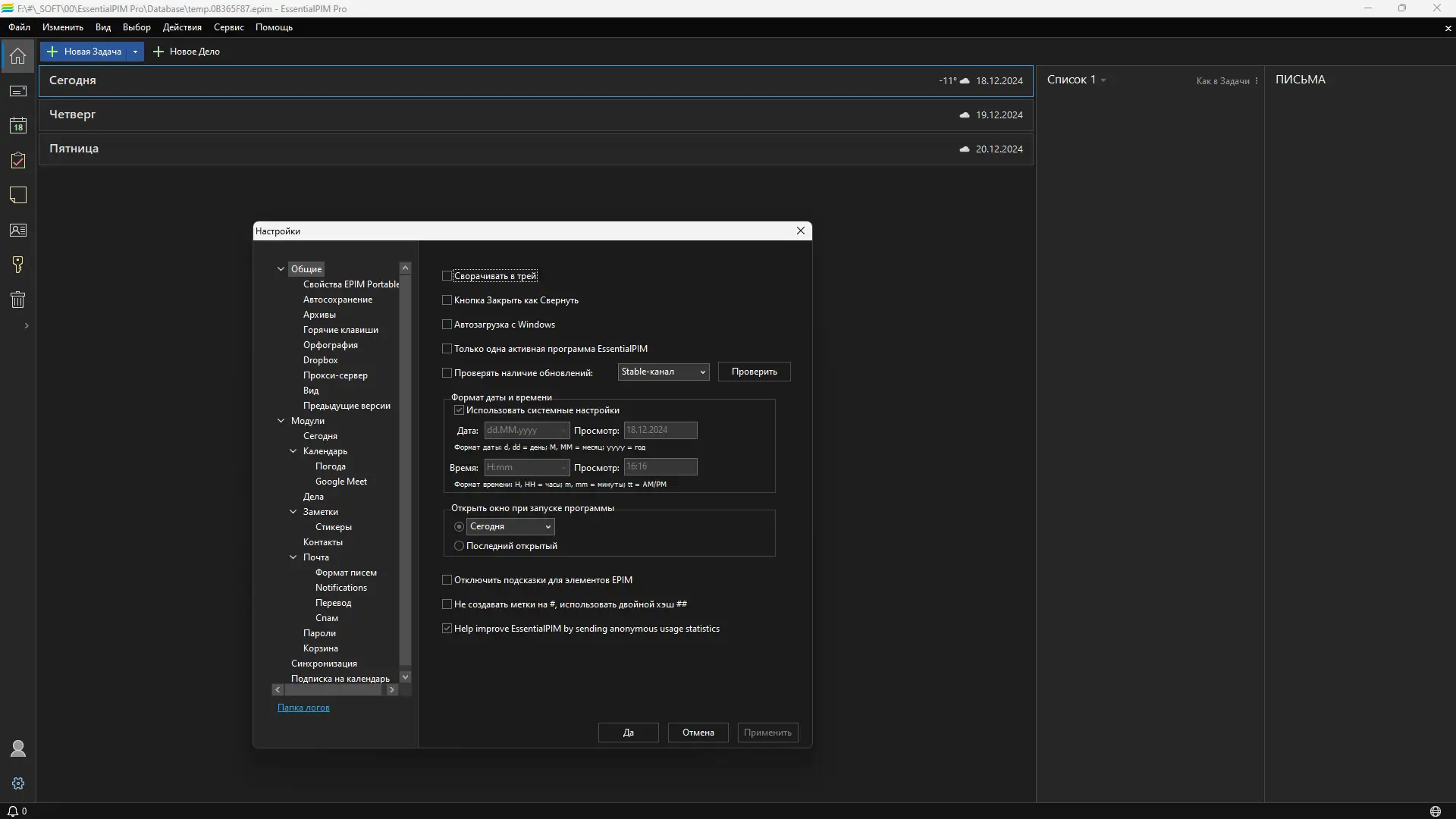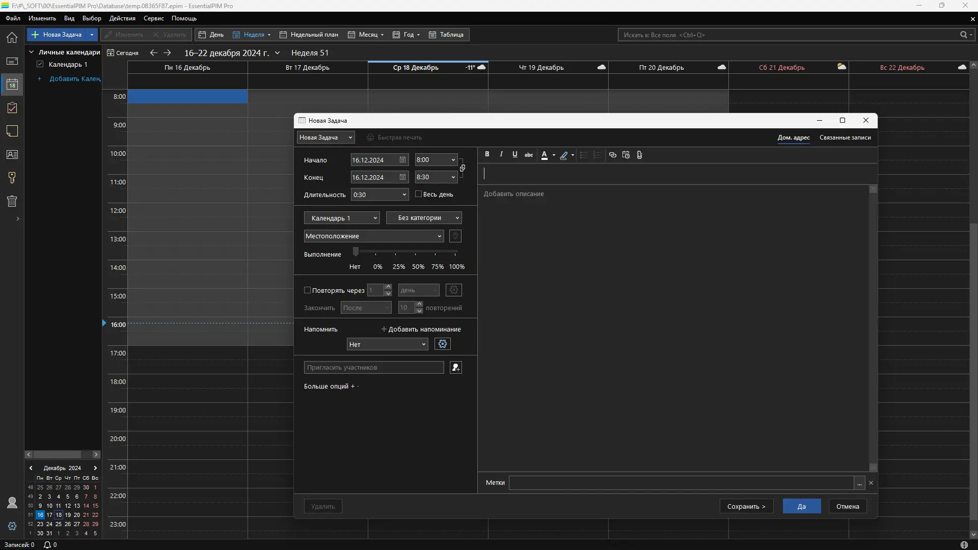 EssentialPIM представляет собой многофункциональное приложение для управления личной и деловой информацией, разработанное как альтернатива таким решениям, как Outlook. Оно объединяет в себе календарь, менеджер задач, почтовый клиент, контакт-центр и хранилище паролей, обеспечивая целостность данных и удобство навигации. Программа активно развивается уже много лет и завоевала признание благодаря стабильности, гибкости и высокой степени настройки.