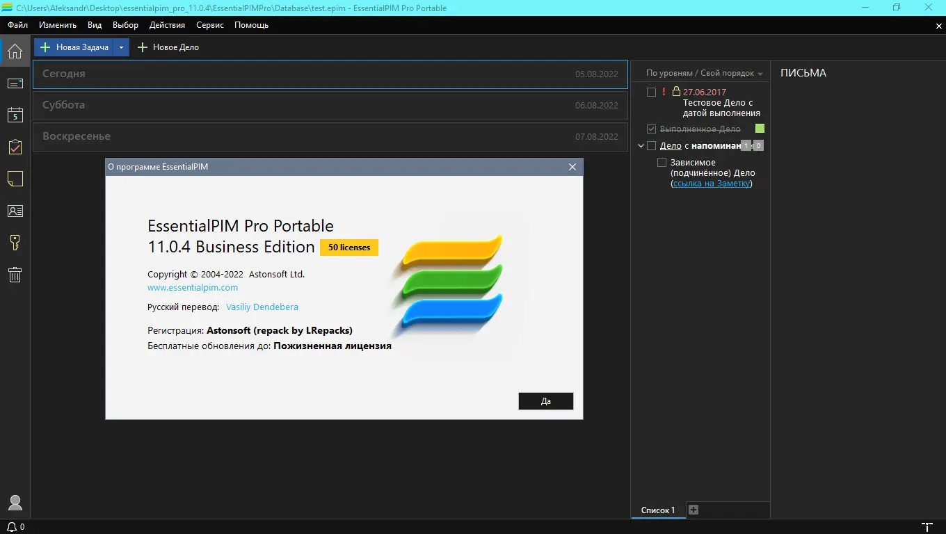 EssentialPIM представляет собой многофункциональное приложение, разработанное для эффективного управления личной и рабочей информацией. Оно позволяет централизованно хранить расписания, списки дел, важные заметки, контактные данные и пароли, обеспечивая быстрый доступ ко всему с любого устройства. Интерфейс интуитивно понятен, а структура модулей делает навигацию простой и логичной.