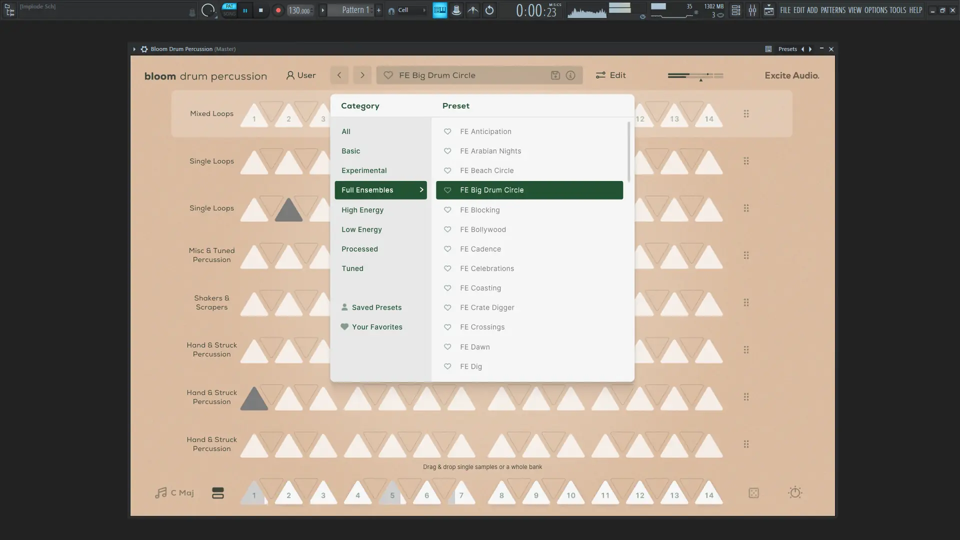 Excite Audio — Bloom Drum Percussion — это мощный инструмент для создания живых перкуссионных грувов с использованием латинских и африканских ритмов, записанных вручную. Программа предлагает 112 высококачественных сэмплов, 250 пресетов и интуитивный секвенсор для мгновенного доступа к ярким ритмическим паттернам.