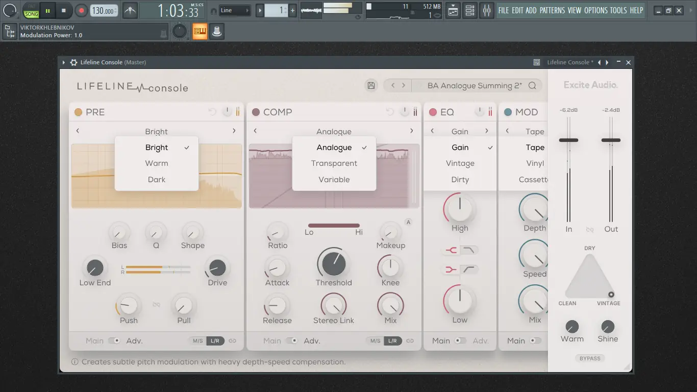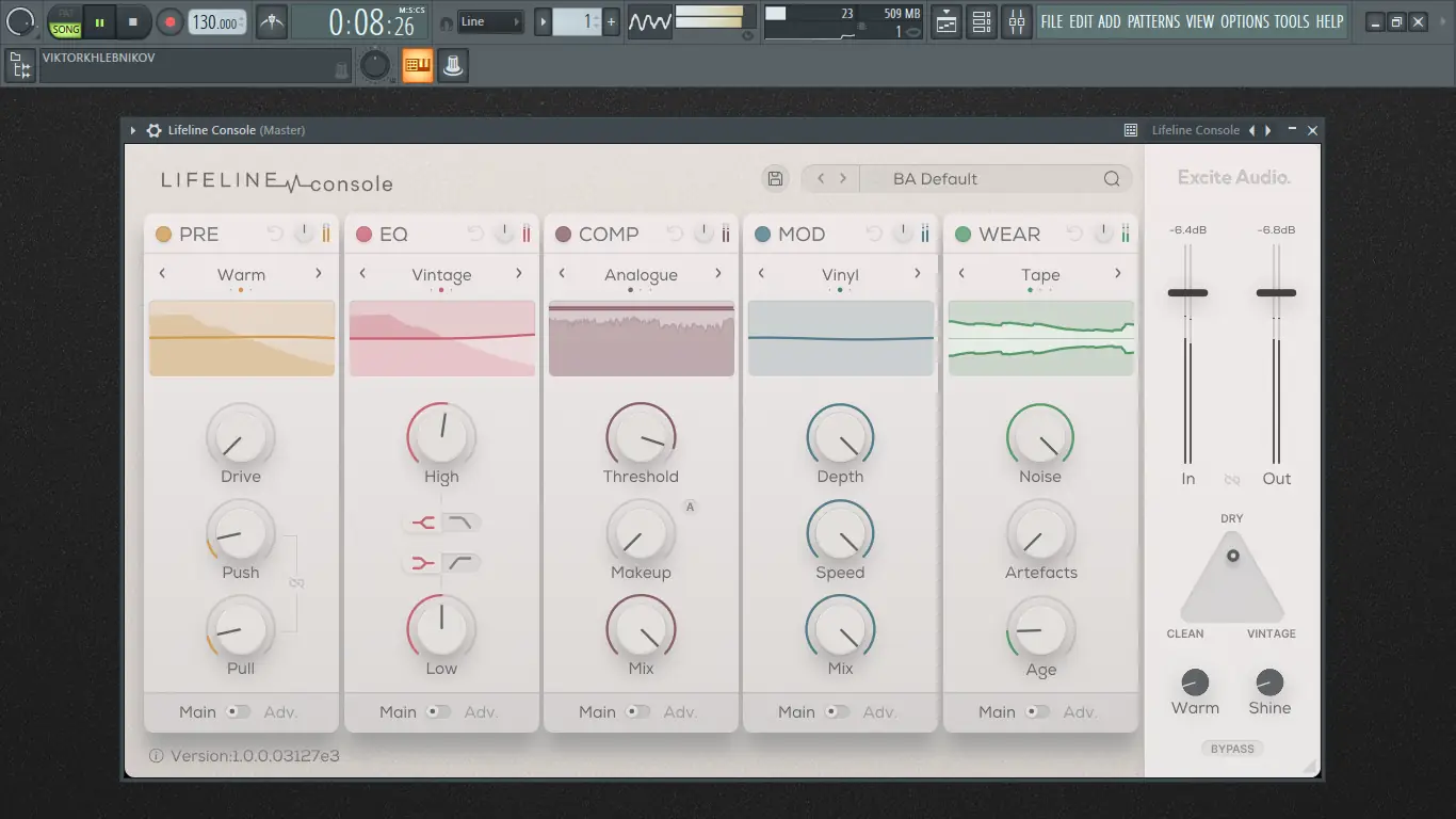 Lifeline Console — это не просто плагин, а полноценная виртуальная консоль, разработанная для создания глубокого и выразительного звучания. Он имитирует поведение аналогового оборудования, включая нелинейности, насыщение и естественные искажения, характерные для студийных приборов прошлых десятилетий. Каждый из пяти встроенных модулей — предварительный усилитель, эквалайзер, компрессор, модулятор и эффект износа — работает автономно, но при этом гармонично интегрируется в общую цепочку обработки.