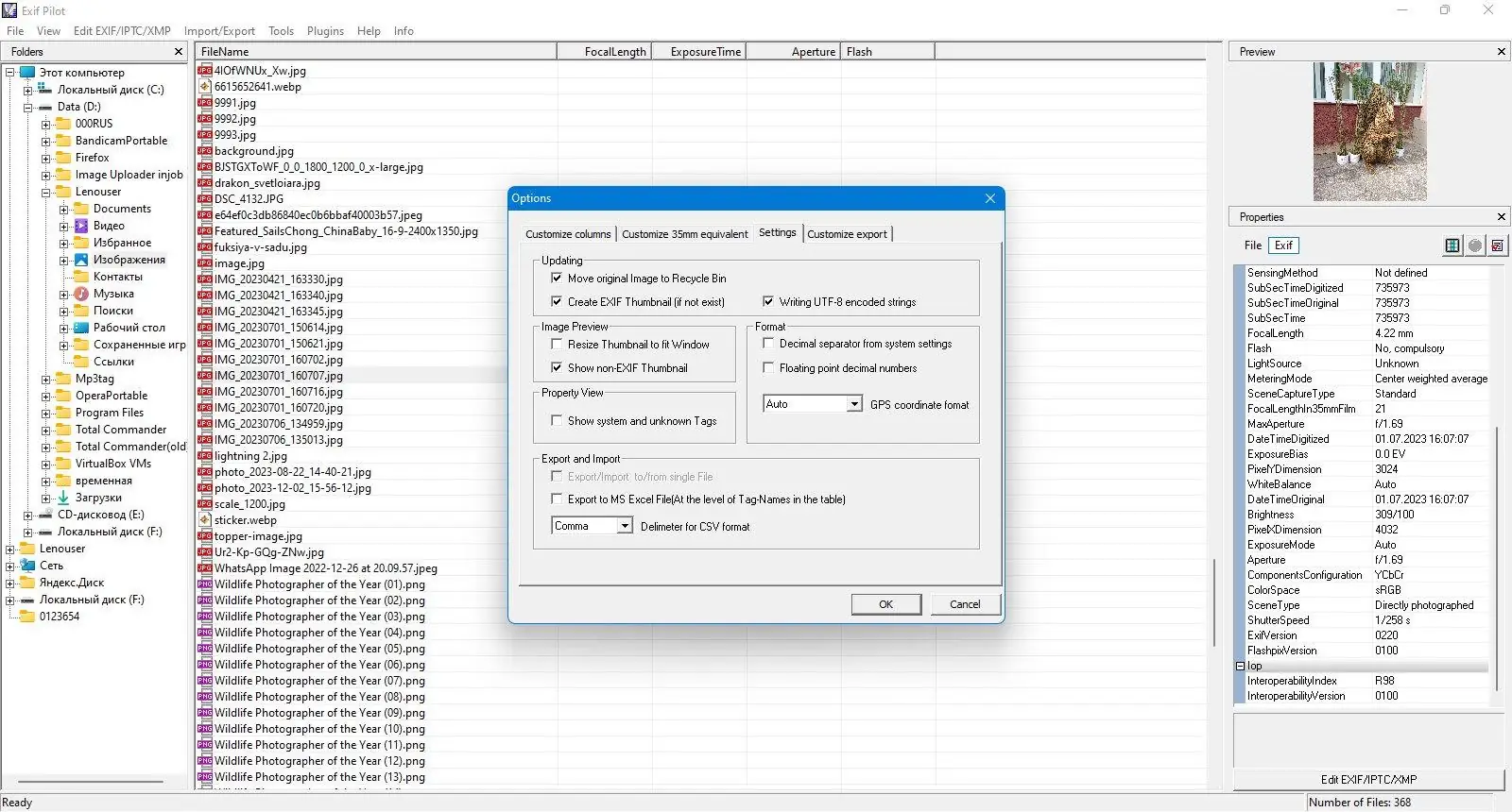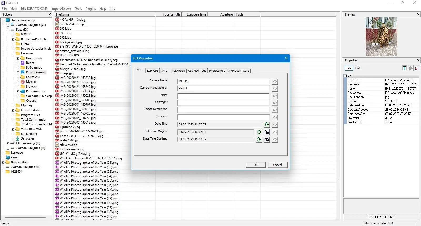 - Поддерживает редактирование и создание метаданных в популярных форматах, включая JPEG, TIFF, PNG и DNG.
