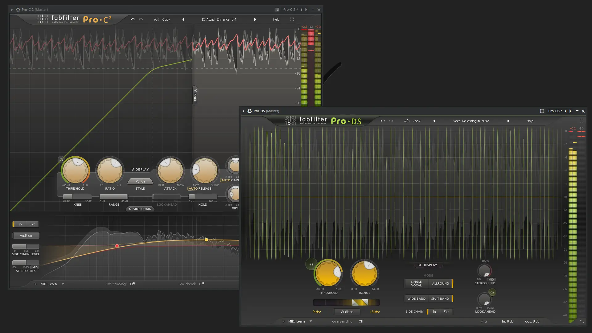 Использование плагинов FabFilter предполагает интеграцию в цифровую аудиостанцию через форматы VST3, AU или CLAP. Интерфейсы построены вокруг интерактивных графиков, позволяя изменять параметры перетаскиванием, напрямую на кривой отклика. Например, в эквалайзере Pro-Q 3 можно добавлять полосы щелчком по графику, настраивать динамическую маску и применять линейную фазу. Компрессоры поддерживают гибкие цепи сайдчейна, многополосную обработку и точную визуализацию атаки и релиза. Работа с ревербератором Pro-R включает настройку времени затухания по частотам и импорт импульсных откликов в формате FLAC. Все плагины поддерживают масштабирование интерфейса и сохранение пользовательских пресетов.