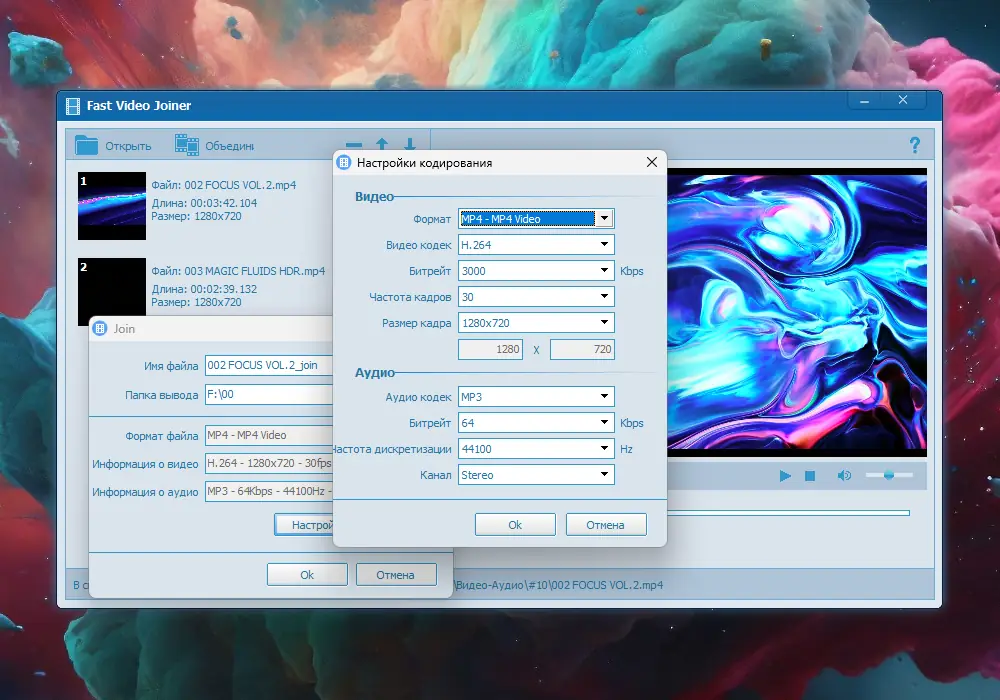- Быстрое объединение неограниченного количества видеозаписей в один файл.