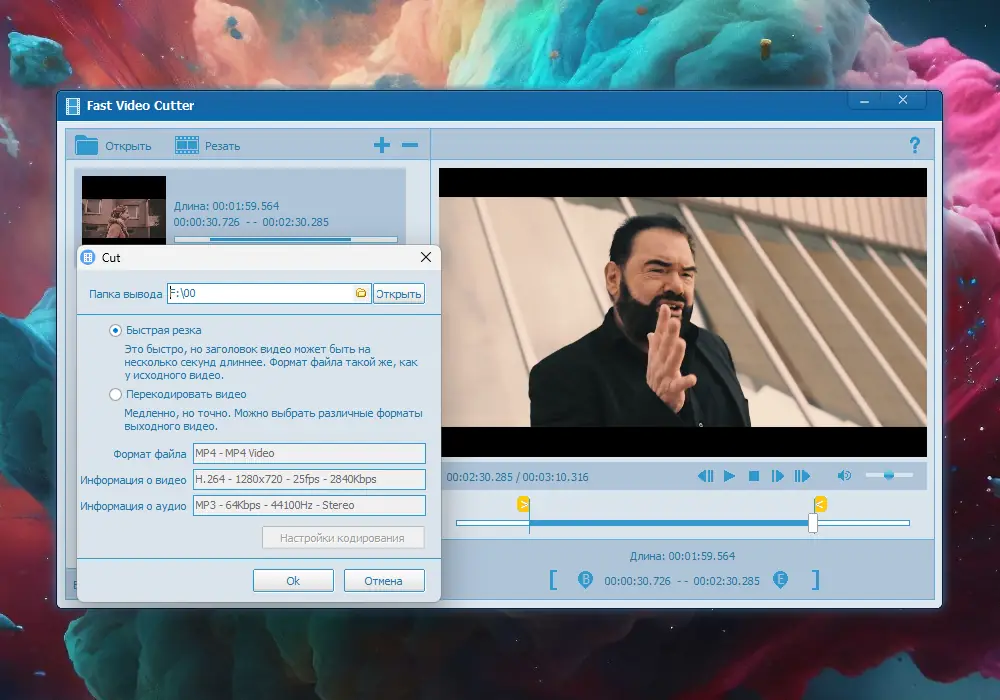 - Возможность вырезать несколько фрагментов видео одновременно с точной настройкой временных меток.