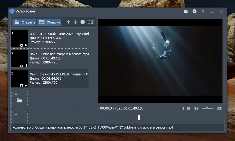 - Объединение неограниченного количества видео в один файл