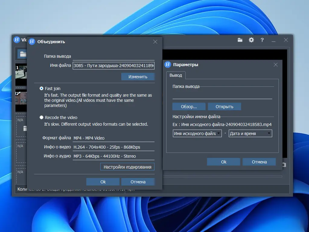 - Объединение неограниченного количества видео в единый файл без перекодирования сохраняет исходное качество.