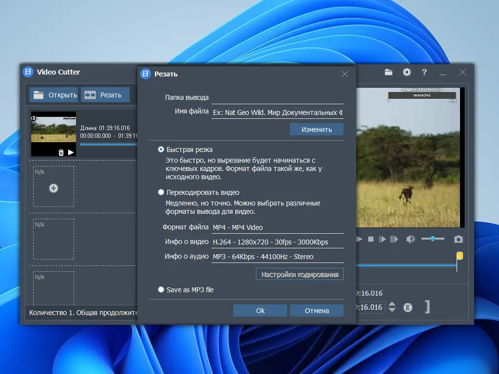 Программа не перекодирует видео при обрезке, что гарантирует отсутствие потерь в качестве изображения и звука.