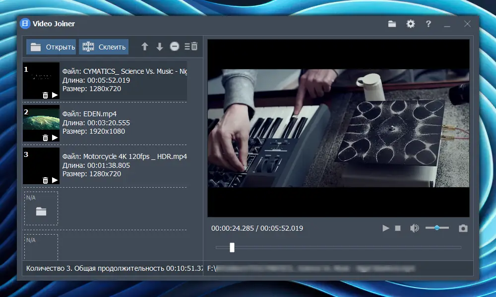 Использование приложения не требует специальных знаний. После запуска достаточно перетащить файл в интерфейс или добавить его через кнопку выбора. Далее пользователь устанавливает начальную и конечную точки вырезаемого фрагмента, используя слайдер или точный ввод времени. При необходимости можно выделить несколько отрезков за один раз. Для объединения видео файлы добавляются в список, упорядочиваются по желанию, после чего запускается процесс склейки. Готовый результат сохраняется в выбранном формате без изменения качества.