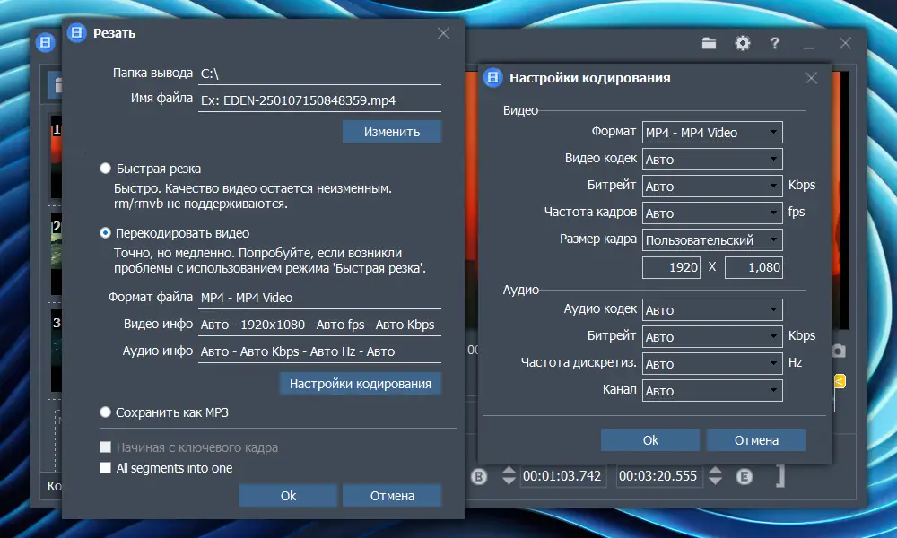 - Позволяет вырезать нужные фрагменты из видео с точностью до миллисекунды.