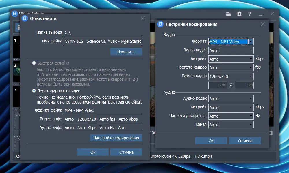 - Обеспечивает быстрое объединение файлов в единое видео без перекодирования потоков.