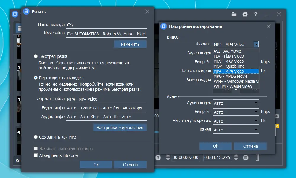 - Обрезка видео с сохранением исходного качества