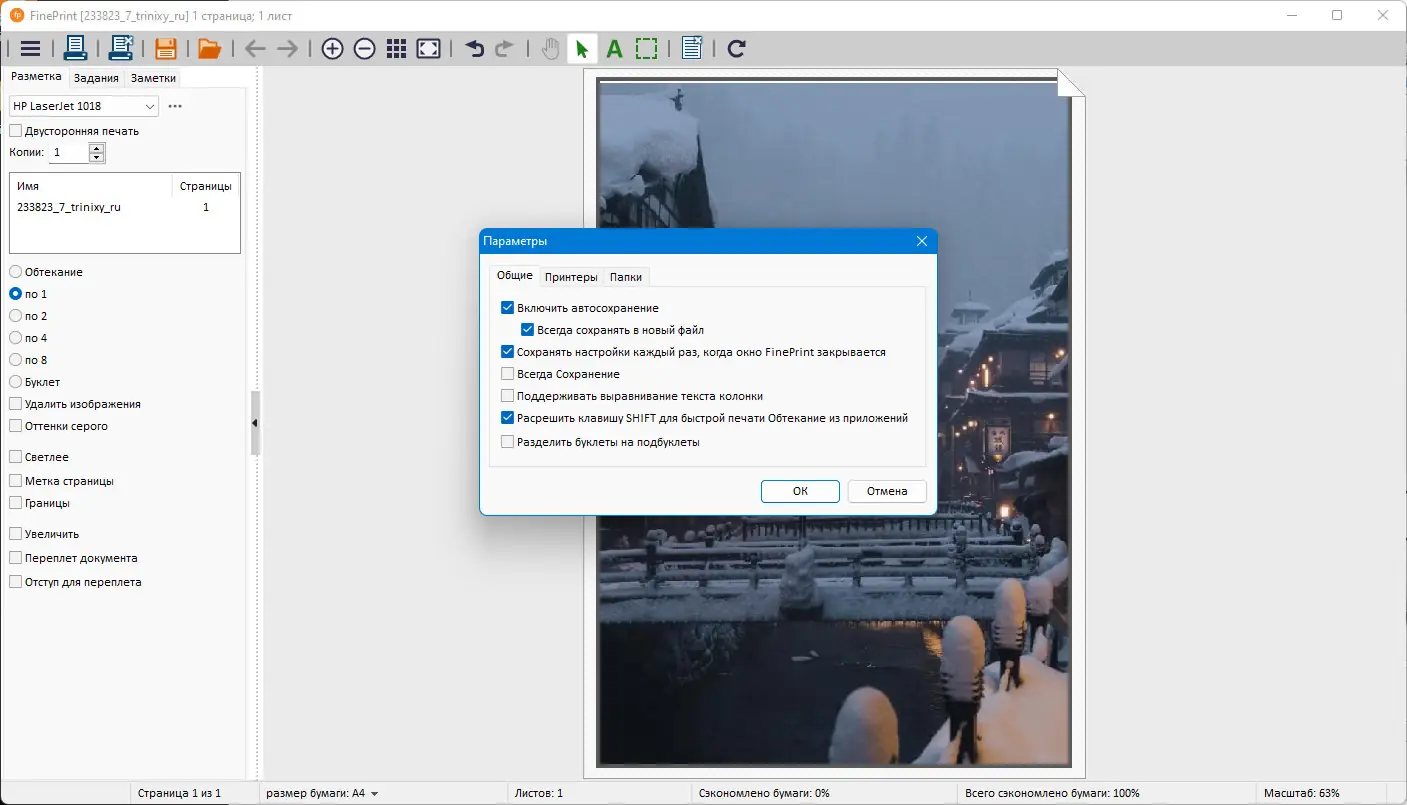 После выбора FinePrint в качестве устройства печати, пользователь попадает в специальное окно настройки, где может просмотреть все страницы документа, изменить их порядок, удалить лишние или вставить новые. Доступны режимы групповой печати: 2, 4 или 8 страниц на лист, а также функция масштабирования больших форматов под стандартный лист. Можно настроить поля, добавить отступы для переплёта и активировать двустороннюю печать. Для часто используемых шаблонов, например, фирменных бланков или буклетов, доступно создание отдельных профилей, которые сохраняются как отдельные виртуальные принтеры. Результат обработки можно сохранить в виде графического файла — JPEG, TIFF или BMP — или экспортировать как текст. Также поддерживается объединение нескольких задач печати в один документ, что упрощает печать составных отчётов.