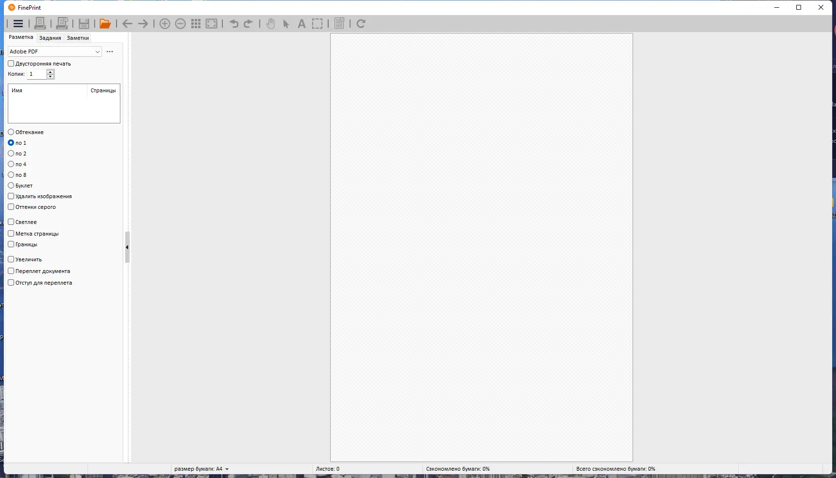 После установки FinePrint появляется в списке доступных принтеров, и для его использования достаточно выбрать его при печати из любого приложения. В открывшемся интерфейсе отображается полный макет документа, где можно редактировать содержимое, удалять лишние страницы или добавлять новые. Все изменения применяются в реальном времени, что позволяет точно контролировать конечный результат. Доступны режимы масштабирования, вставка системных данных, настройка полей и отступов под переплёт. Сохранённые настройки можно экспортировать или использовать для создания виртуальных принтеров с определёнными параметрами.
