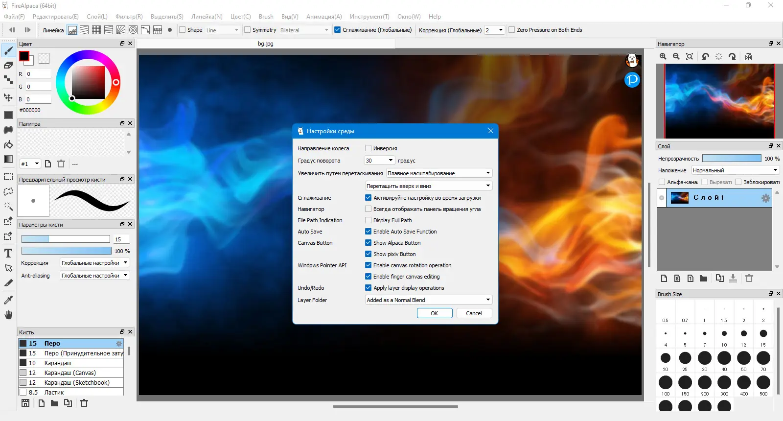 FireAlpaca представляет собой компактное приложение, ориентированное на рисование и редактирование растровой графики. Интерфейс выполнен в классической компоновке, знакомой пользователям других графических редакторов, что упрощает освоение. Основные инструменты включают кисти с настройкой прозрачности и жесткости, ластик, заливку, перо, волшебную палочку и инструмент лассо. Поддержка слоёв позволяет работать с несколькими элементами изображения независимо, что особенно полезно при создании иллюстраций. Программа поддерживает популярные форматы: JPG, PNG, BMP, GIF, PSD и собственный MDP. Это делает её совместимой с другими редакторами и удобной для обмена проектами. Работа с цветокоррекцией, изменение размера холста, поворот и обрезка изображений реализованы на уровне, достаточном для базовых задач.