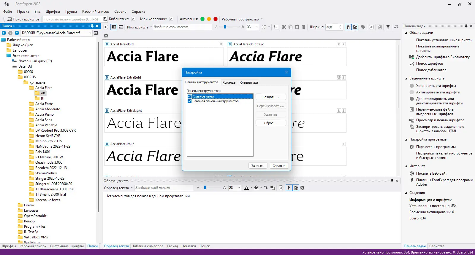 Интерфейс программы интуитивно понятен и организован в виде нескольких панелей для навигации. В левой части окна отображаются папки и группы шрифтов, в центральной — список доступных гарнитур, а в правой — детальный предпросмотр. Для просмотра шрифта достаточно выделить его и выбрать нужный режим отображения. Управление файлами осуществляется через контекстное меню или перетаскивание элементов. Установка и деактивация шрифтов выполняются одним кликом, без необходимости перезагрузки системы. Также можно быстро распечатать образцы или таблицы символов для архивации или сравнения.