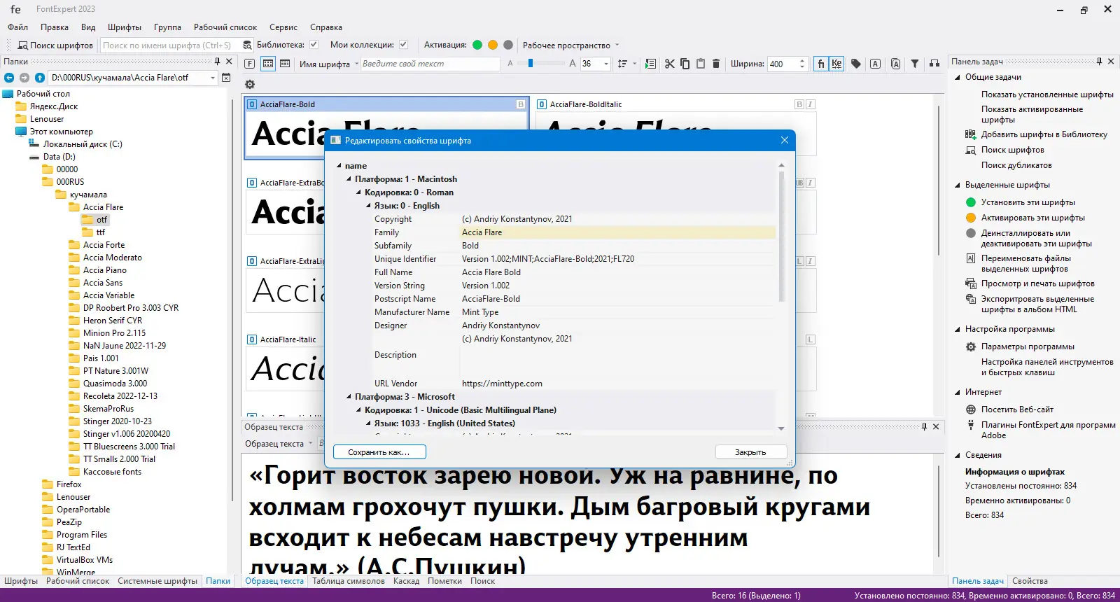 FontExpert предоставляет комплексное решение для работы с шрифтами на локальных и сетевых устройствах. Программа позволяет не только просматривать установленные гарнитуры, но и предварительно оценивать шрифты, хранящиеся на жёстких дисках, съёмных носителях или оптических дисках. Поддержка множества режимов предпросмотра, включая отображение текста с применением выбранного начертания, таблицу символов и образцы шрифтов, делает процесс выбора максимально точным. Пользователь может настраивать размер, цвет и стиль текста, чтобы оценить внешний вид гарнитуры в различных условиях.