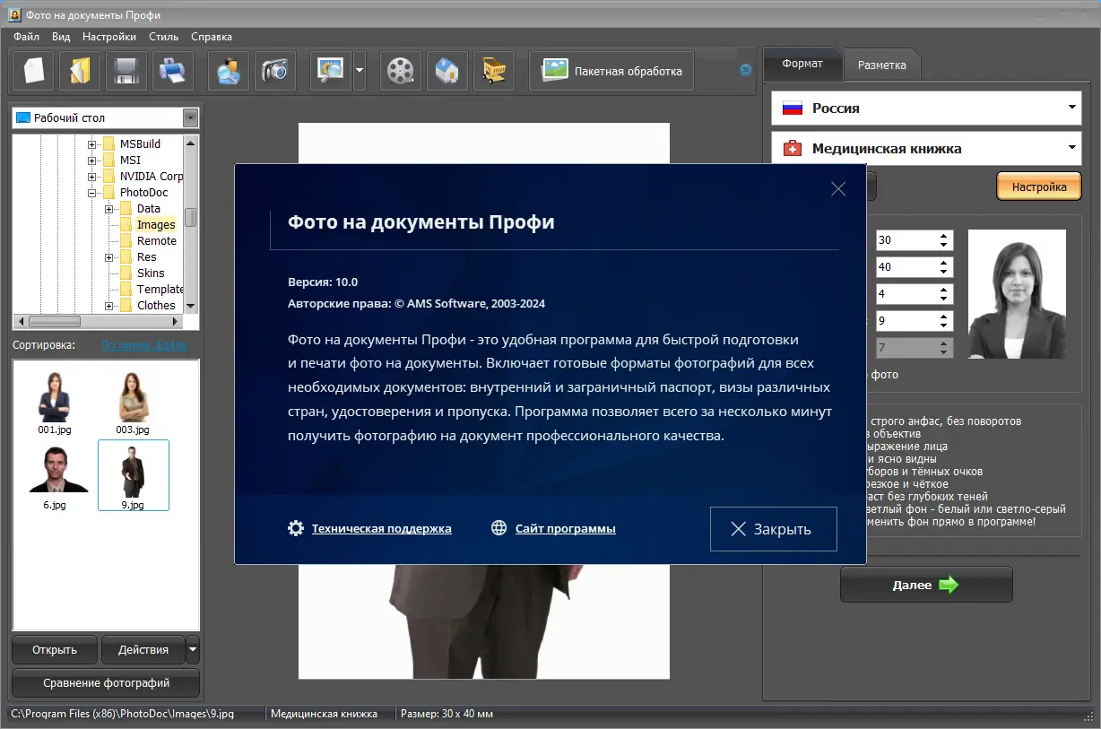 Фото на документы Профи — это специализированное программное обеспечение, предназначенное для автоматической подготовки фотографий, соответствующих требованиям официальных документов. Она объединяет в себе функции редактора изображений, менеджера форматов и системы печати, позволяя избежать посещения фотостудий. Пользователь может самостоятельно создать фото, полностью соответствующее стандартам.