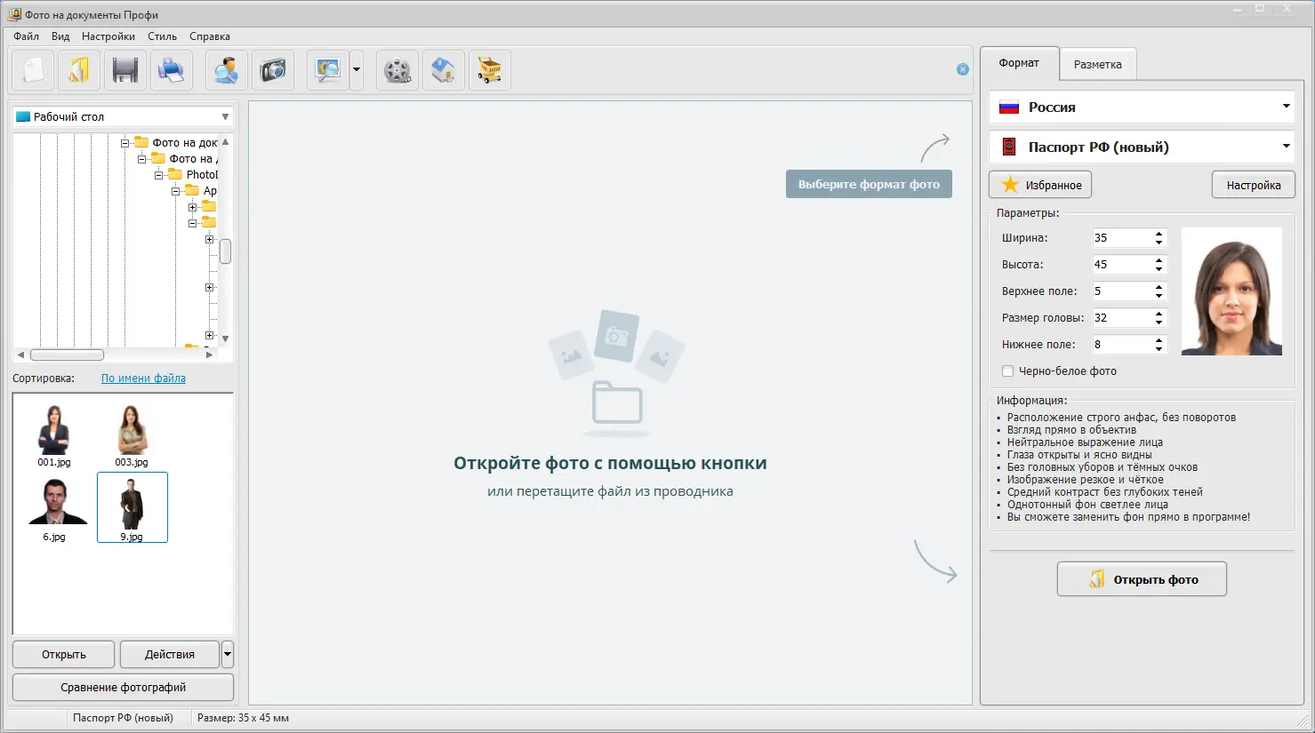 Использование приложения не требует специальных навыков. После запуска выбирается нужный формат документа, после чего загружается изображение. С помощью маркеров выделяются ключевые точки лица — глаза, нос, контур головы. Система автоматически корректирует размер и положение. Далее доступна ручная настройка: изменение фона, яркости, контраста, а также замена одежды. Встроенные шаблоны костюмов позволяют подобрать подходящий вариант — деловой, повседневный или военный. После завершения редактирования можно сохранить макет или сразу отправить на печать. Программа поддерживает калибровку монитора, что повышает точность цветопередачи при печати на домашнем принтере.
