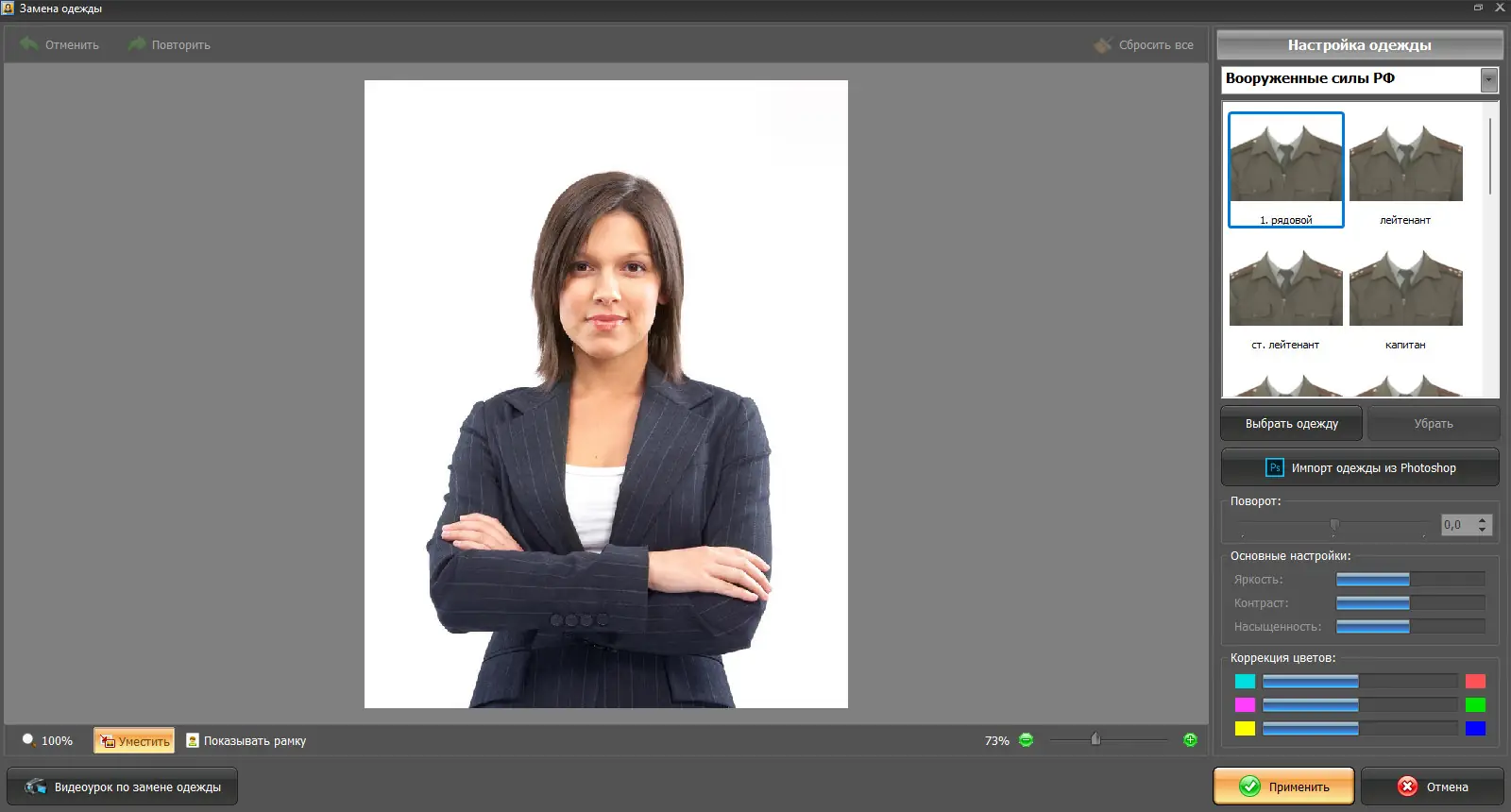 Скачать программу можно для операционных систем Windows 7, 8.1, 10 и 11 разрядностью 32 и 64 бит. Установка проходит быстро, интерфейс полностью на русском языке. После настройки можно сразу приступать к созданию документов. Программа позволяет сделать всё необходимое локально, без необходимости использовать онлайн сервисы. В комплекте идут стандартные шаблоны для 4 основных типов документов, а дополнительные можно импортировать. Бесплатно распространяется пробная версия с ограниченным функционалом. Полная версия открывает доступ ко всем инструментам, включая замену одежды и экспорт в высоком разрешении.