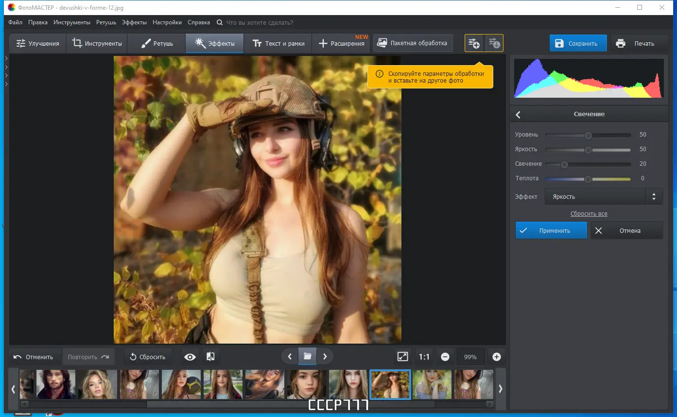 - Галерея художественных эффектов, включая HDR, виньетирование, ретро-фильтры и чёрно-белое тонирование.